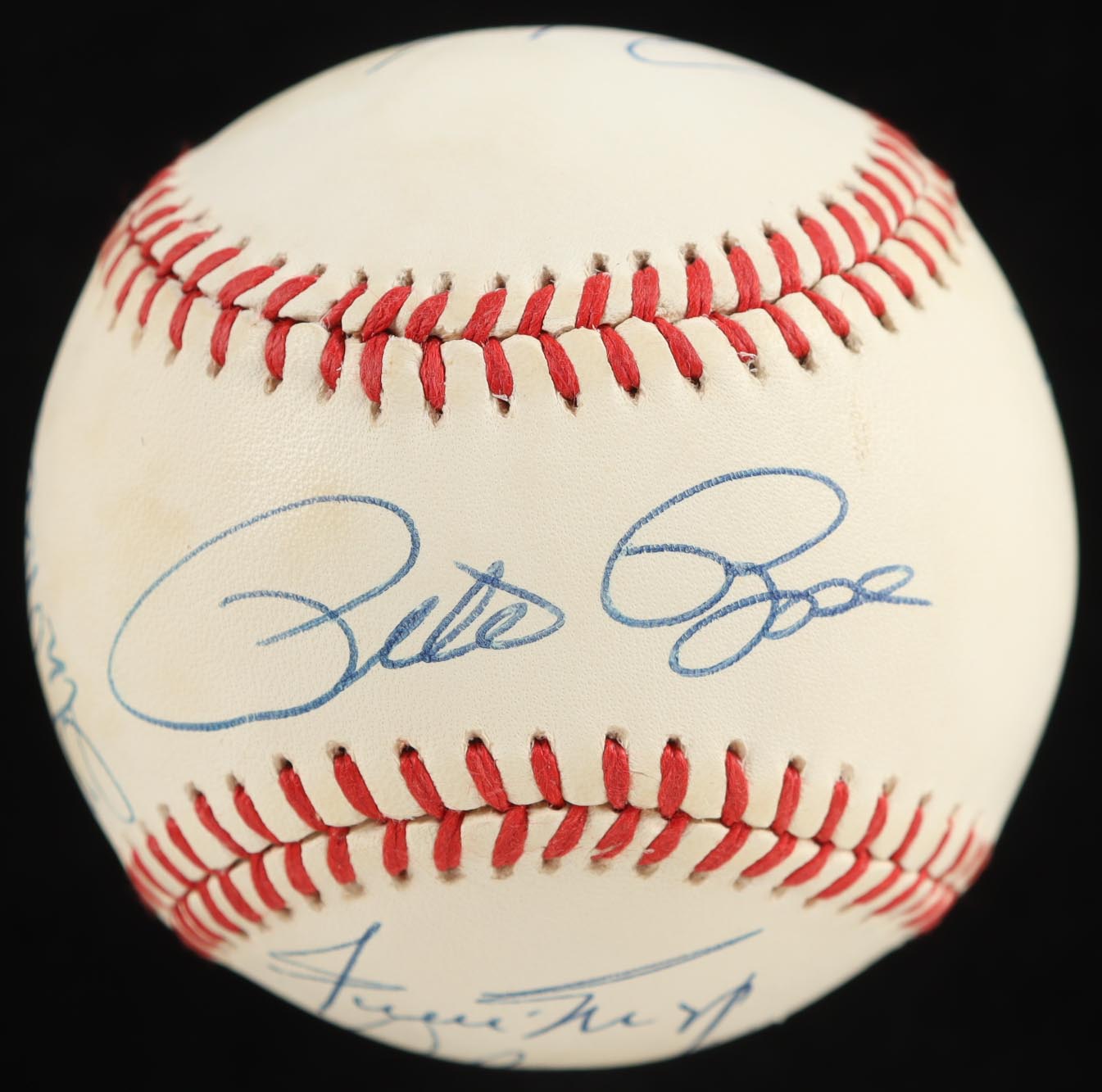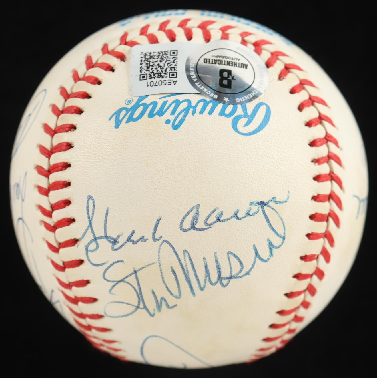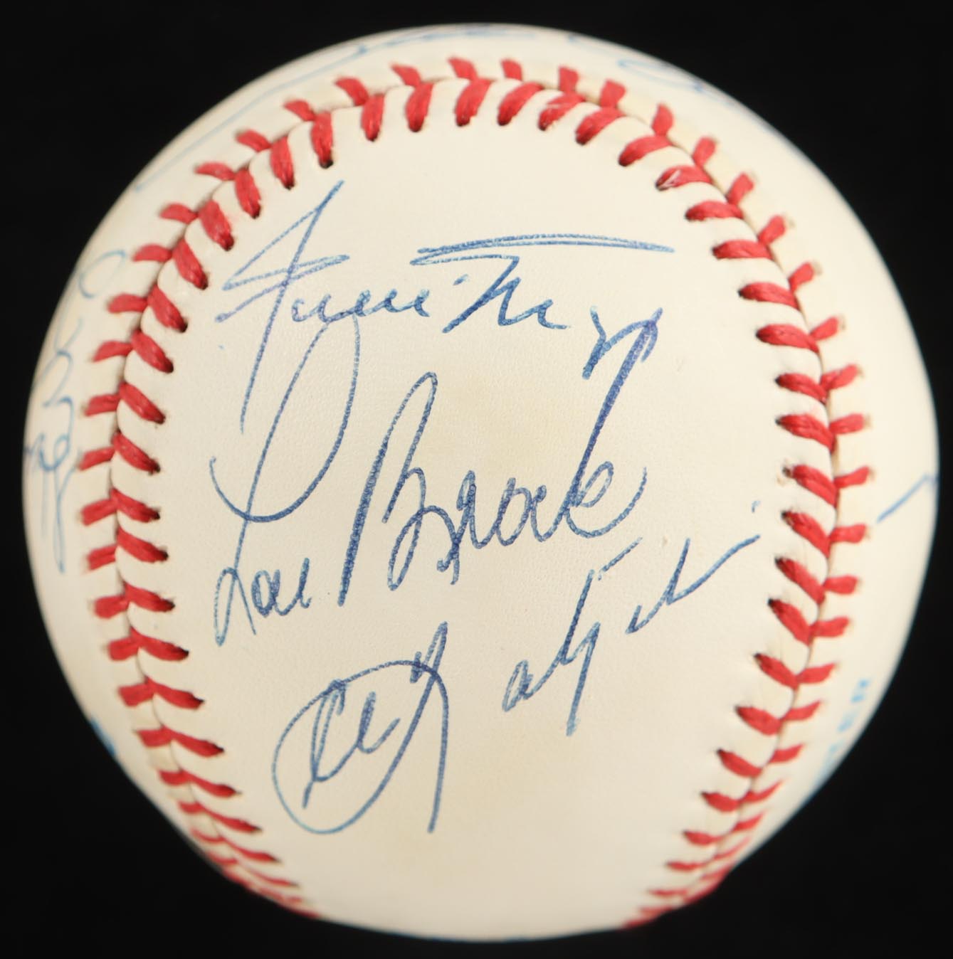 Rawlings Official American League Baseball with display case. Hand-signed by (9) with Stan Musial, Hank Aaron, Craig Biggio, Willie Mays, Lou Brock, Carl Yastrzemski, Al Kaline, Rod Carew, and Pete Rose.