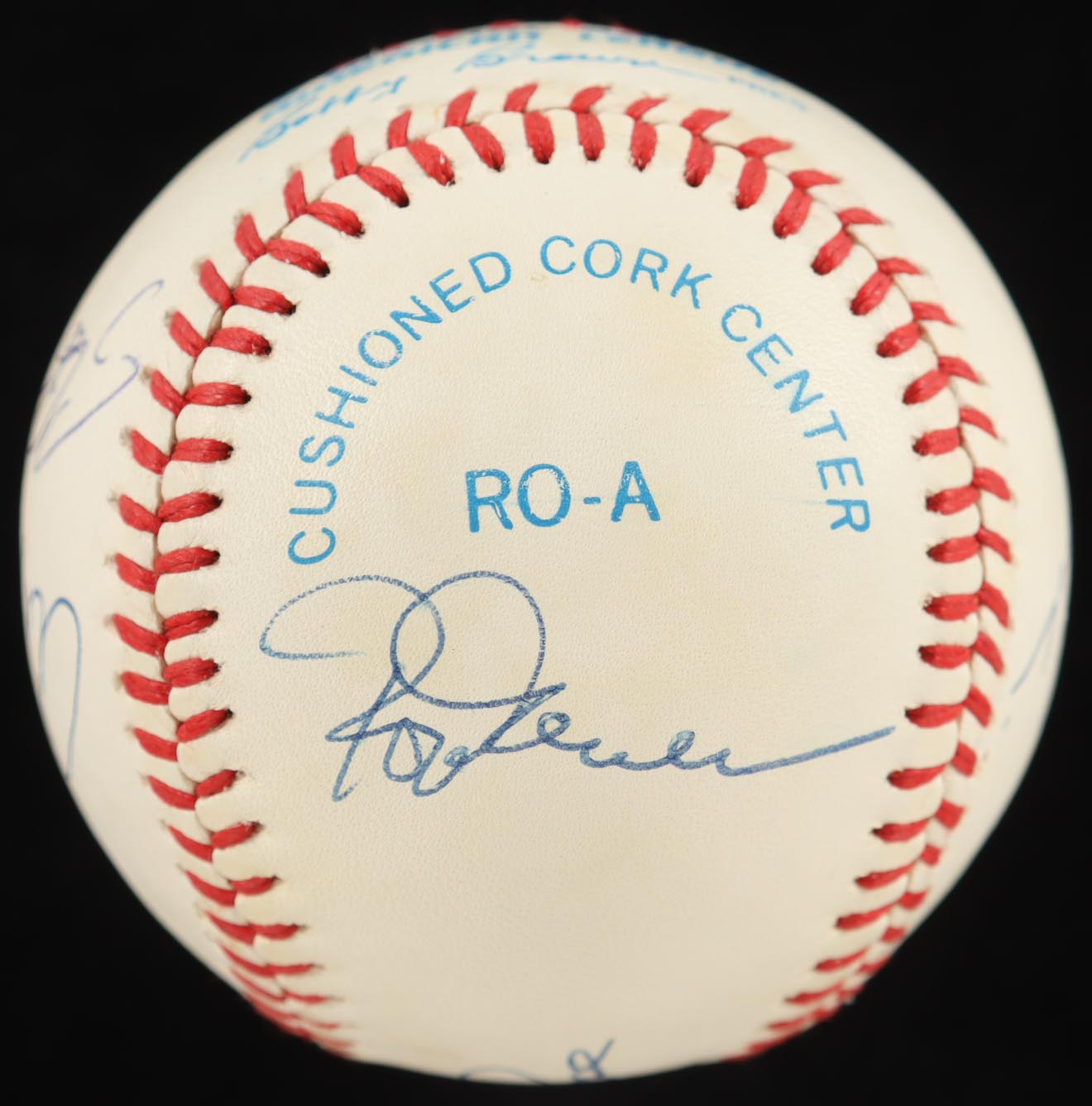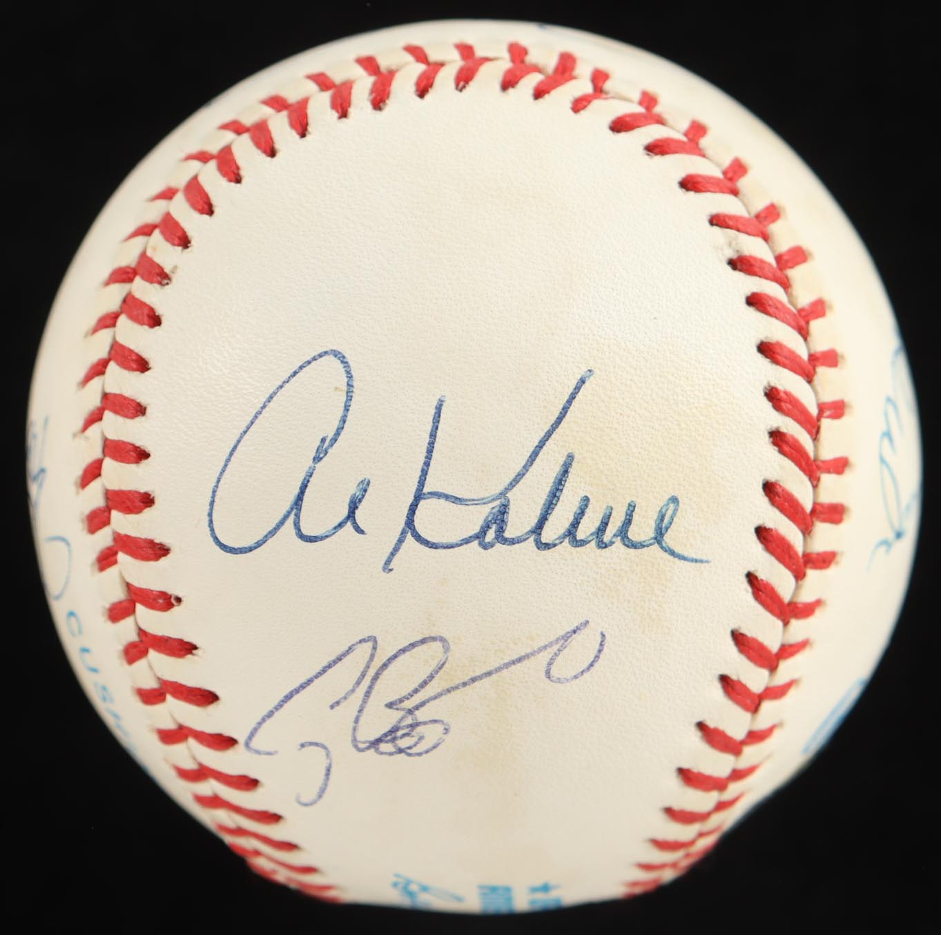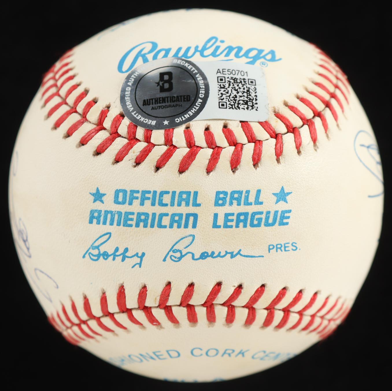Rawlings Official American League Baseball with display case. Hand-signed by (9) with Stan Musial, Hank Aaron, Craig Biggio, Willie Mays, Lou Brock, Carl Yastrzemski, Al Kaline, Rod Carew, and Pete Rose.