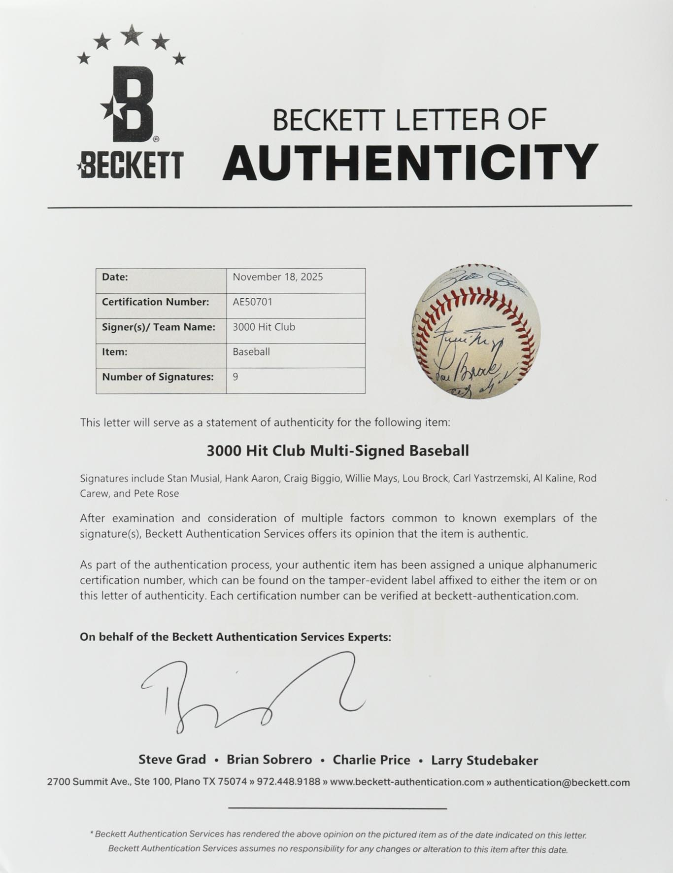 The autograph includes an official Beckett Authentication Services hologram and matching LOA for authenticity purposes.