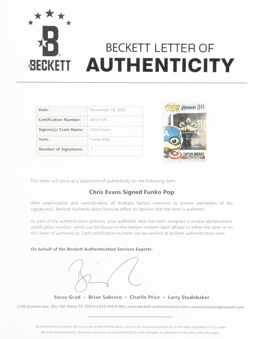 Chris Evans Signed "Avengers: Endgame" Captain America #573 Funko Pop Bobble-Head Figure (Beckett)