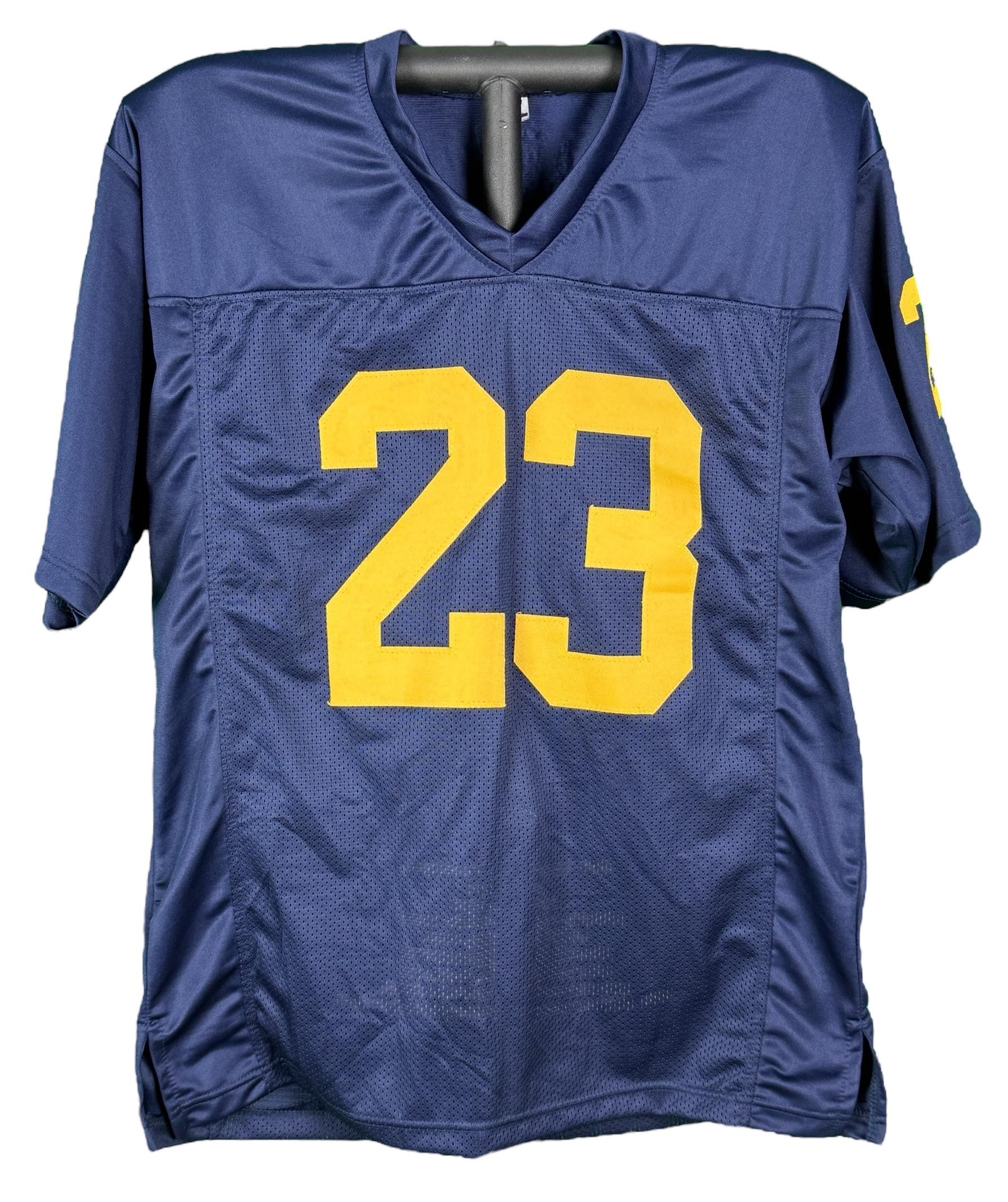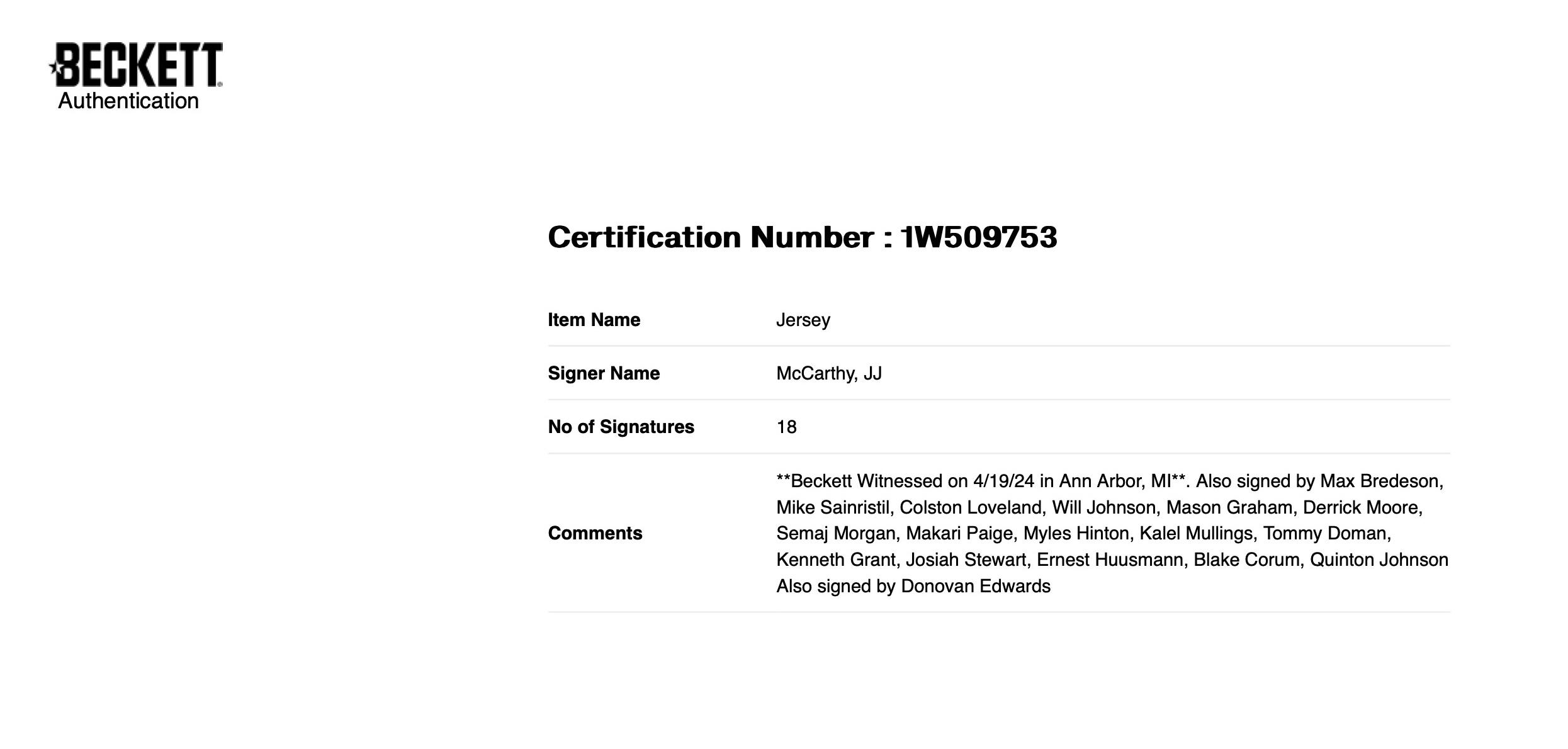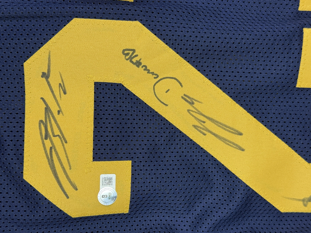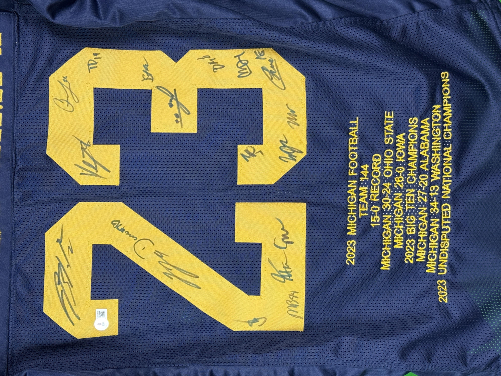 Custom jersey with everything sewn on, size XL. Hand-signed by (18) with JJ McCarthy, Max Bredeson, Mike Sainristil, Colston Loveland, Will Johnson, Mason Graham, Derrick Moore, Semaj Morgan, Makari Paige, Myles Hinton, Kalel Mullings, Tommy Doman, Kenneth Grant, Josiah Stewart, Ernest Huusmann, Blake Corum, Quinton Johnson, and Donovan Edwards