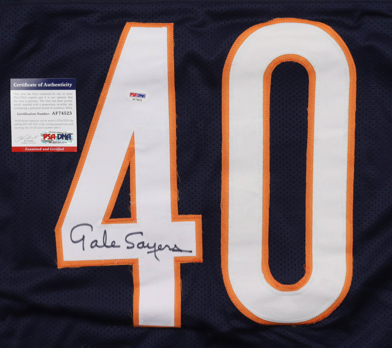 Custom jersey with everything sewn on, size XL. Hand-signed by Gale Sayers (D. 2020, HOF). Please note, glue is visible through the jersey numbers.