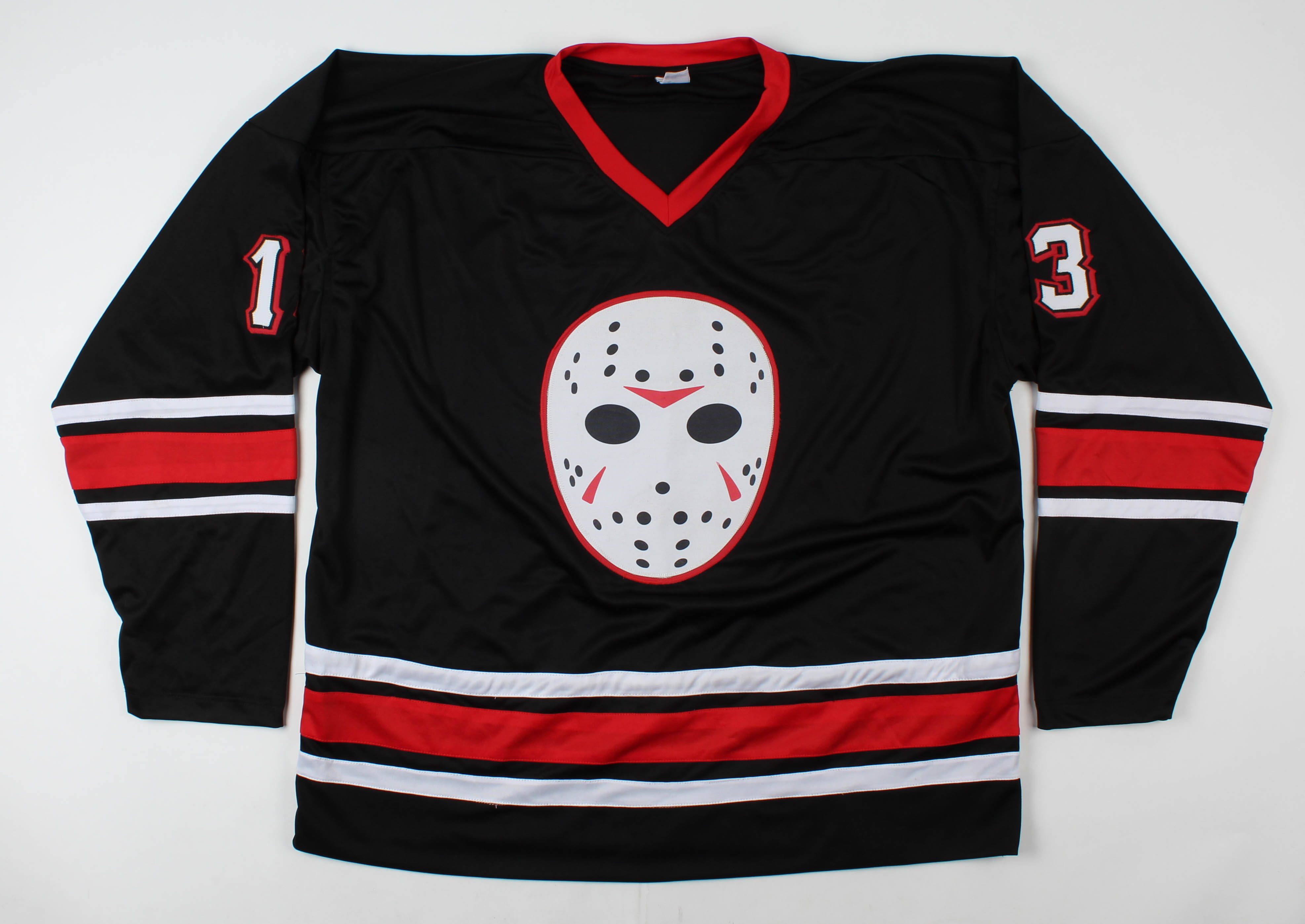 Custom on-ice style jersey. Everything is sewn on, size XL. Hand-signed by Ari Lehman (Jason Voorhees).