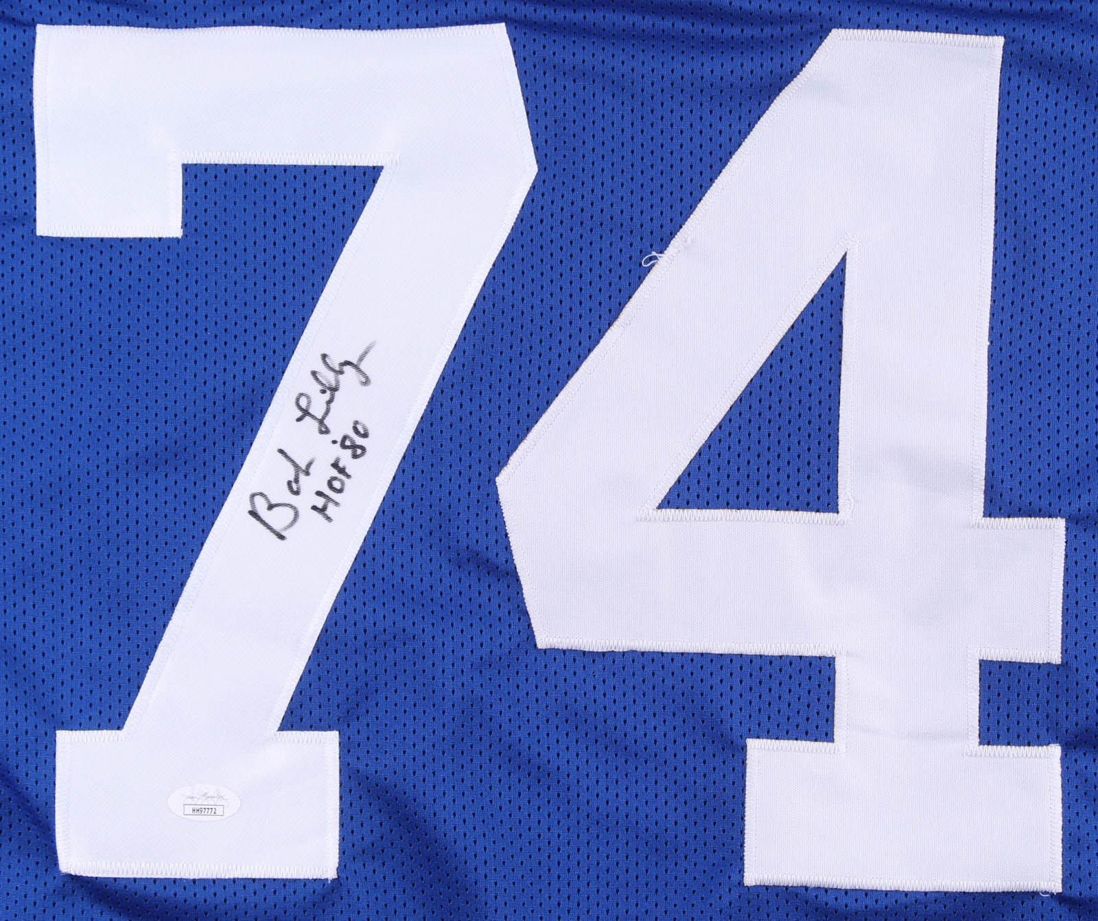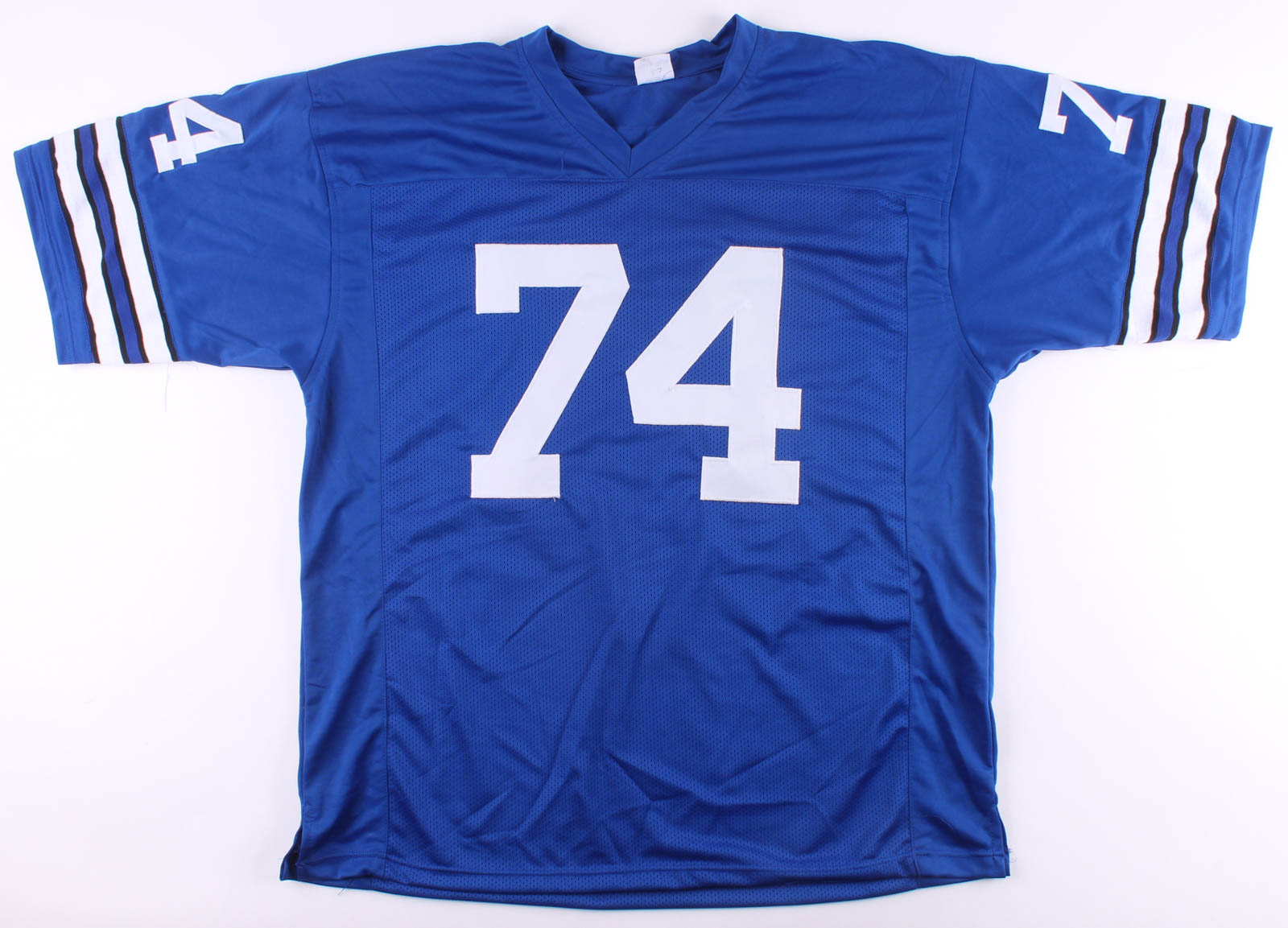 Custom on-field style jersey. Everything is sewn on, size XL. Has been hand-signed in black felt-tip pen by Bob Lilly (HOF).