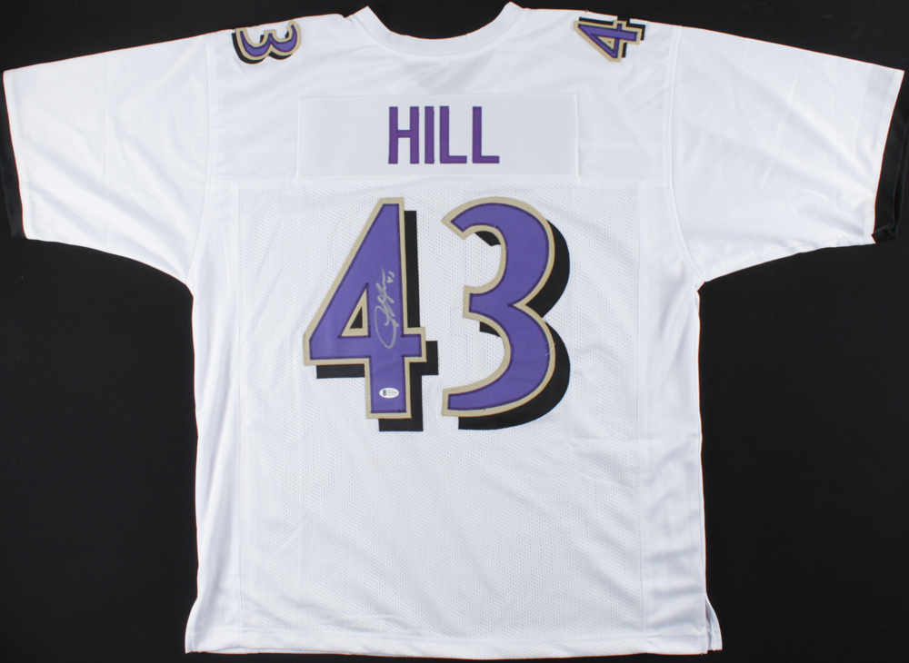 Custom on-field style jersey. Everything is sewn on, size XL. Hand-signed by Justice Hill.