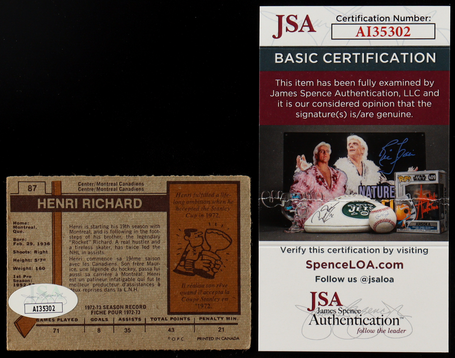 Henri Richard Signed 1973 Topps Hockey #87 (JSA)