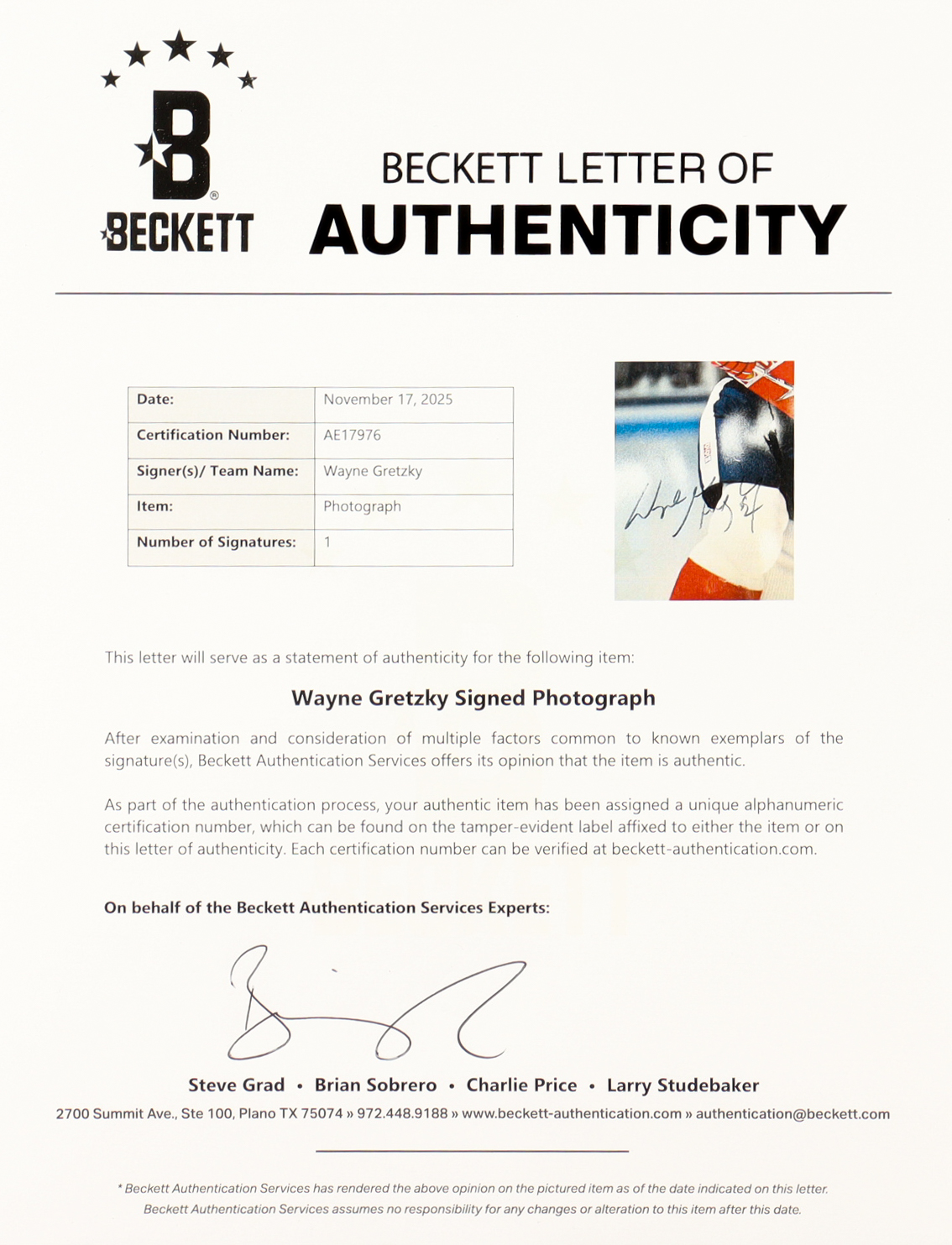 The autograph includes an official Beckett Authentication Services hologram and matching LOA for authenticity purposes.
