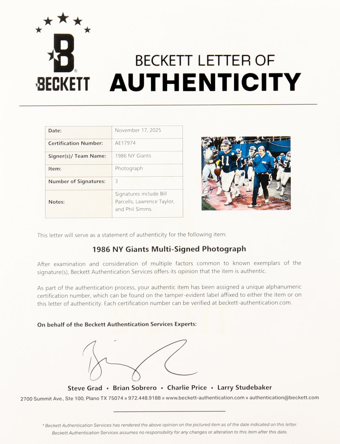 Bill Parcells, Lawrence Taylor & Phil Simms Signed Giants 16x20 Photo (Beckett)