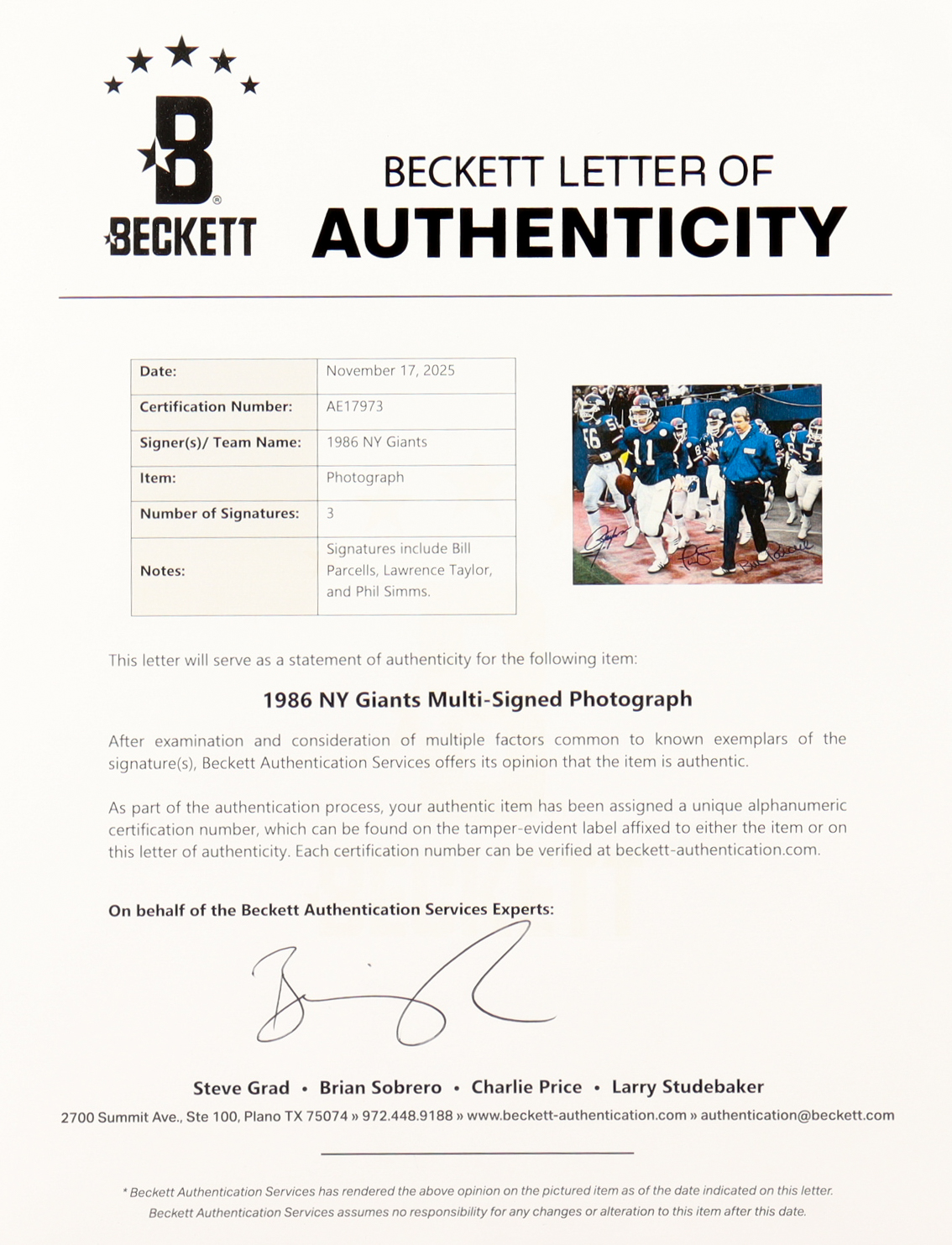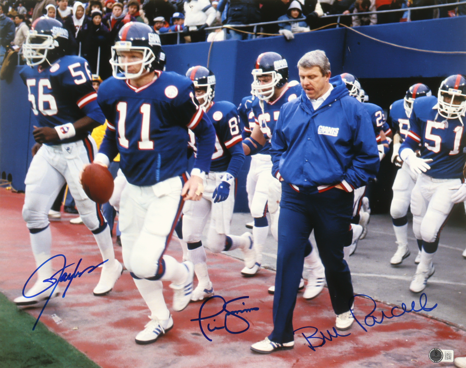 Photo measures 16" x 20" in size. Hand-signed by Bill Parcells, Lawrence Taylor and Phil Simms (New York Giants).