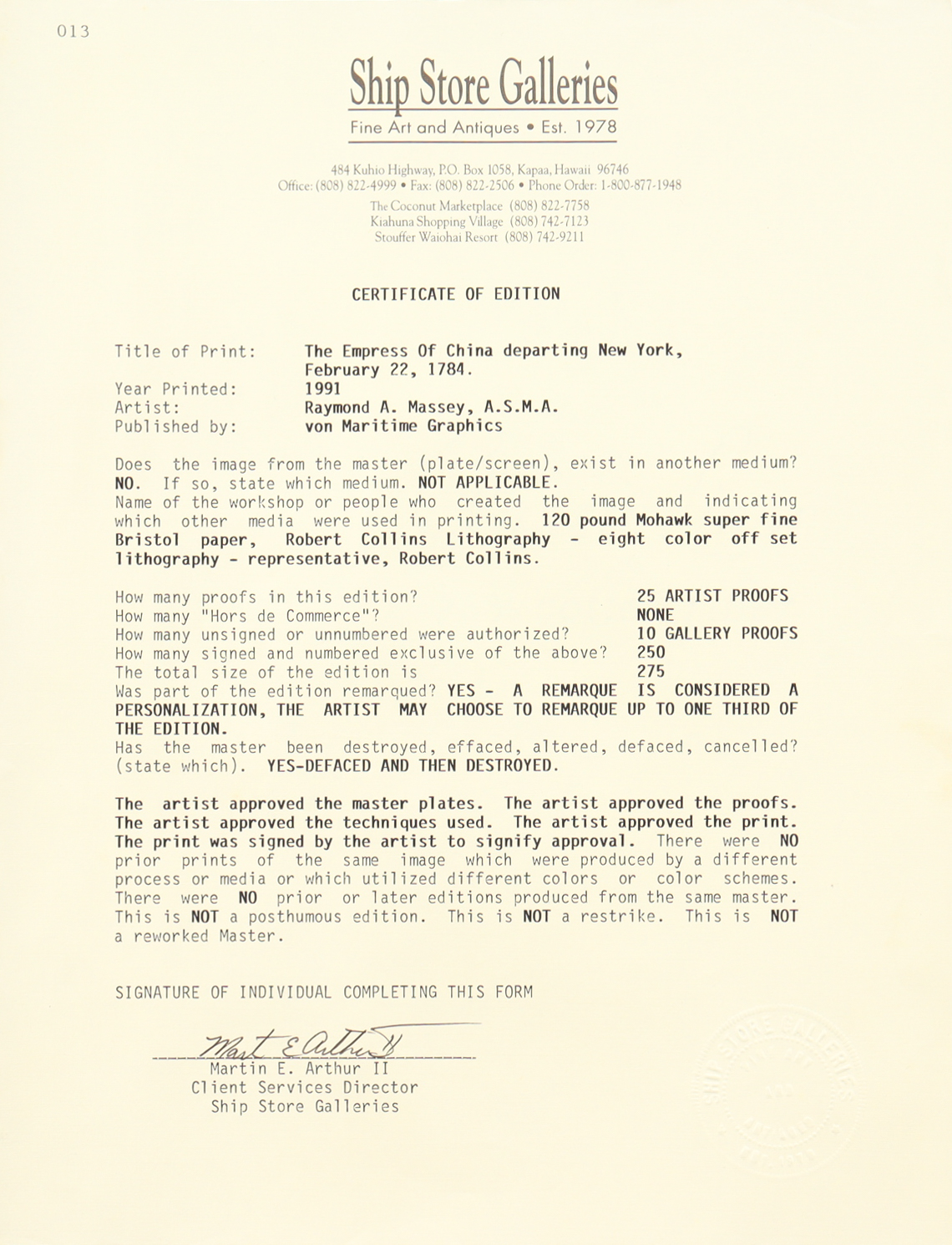 The lithograph includes a Certificate of Edition from Ship Store Galleries.