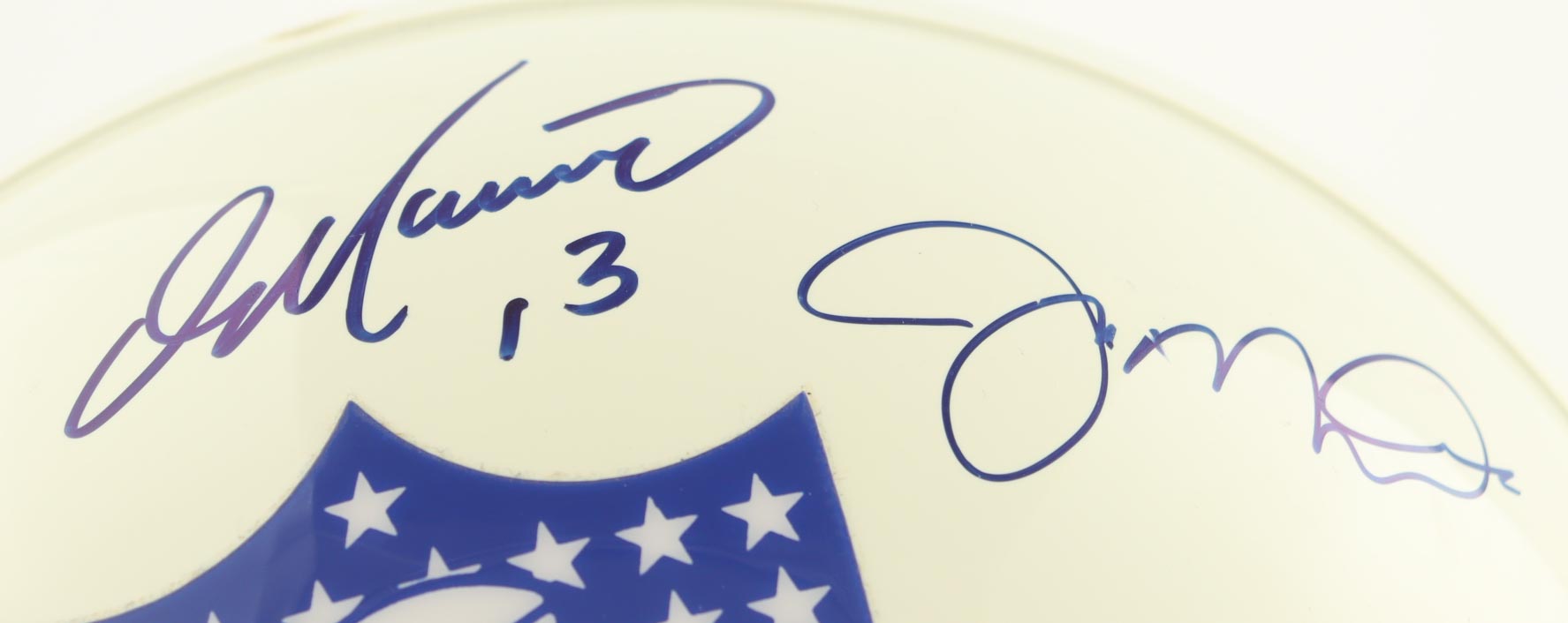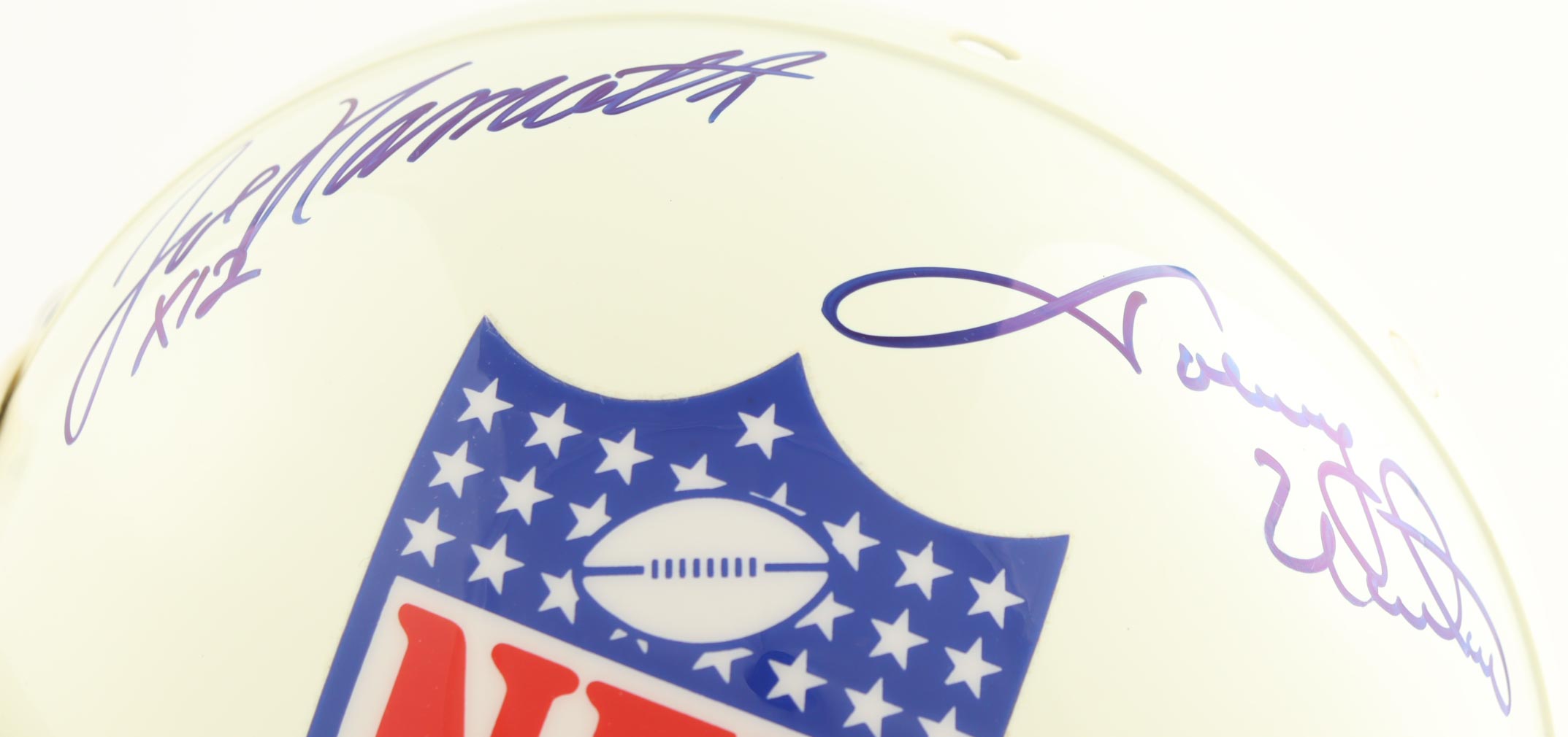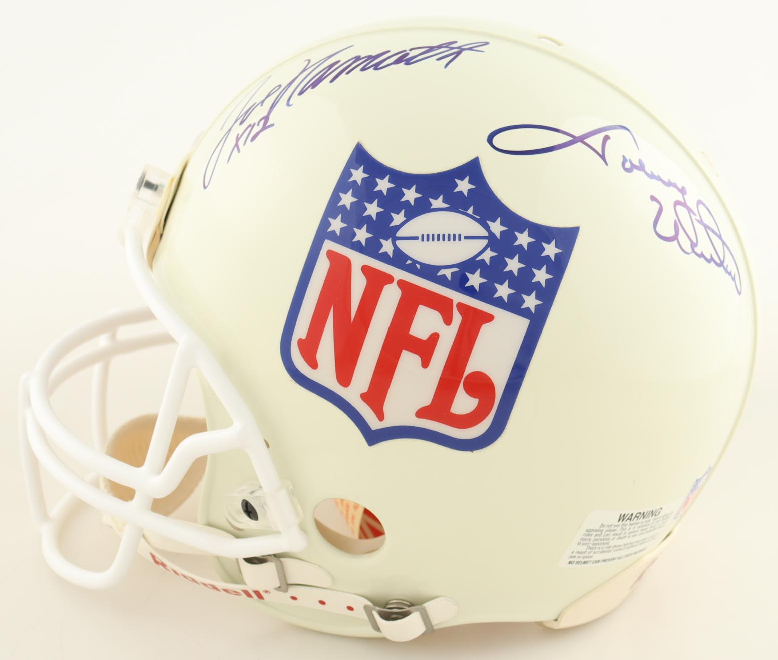 NFL Shield logo full-size authentic helmet. Hand-signed and inscribed by (4) with Johnny Unitas, Dan Marino, Joe Namath and Joe Montana. Please note, the helmet has general discoloration, slight scuffing and smudging on the signatures. Please see photos for further details regarding the condition of the helmet.