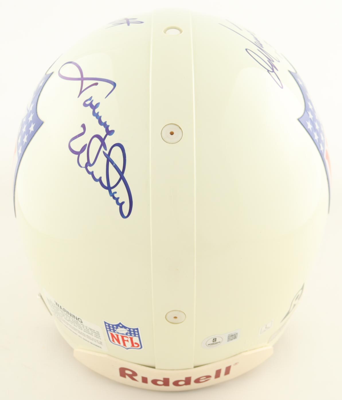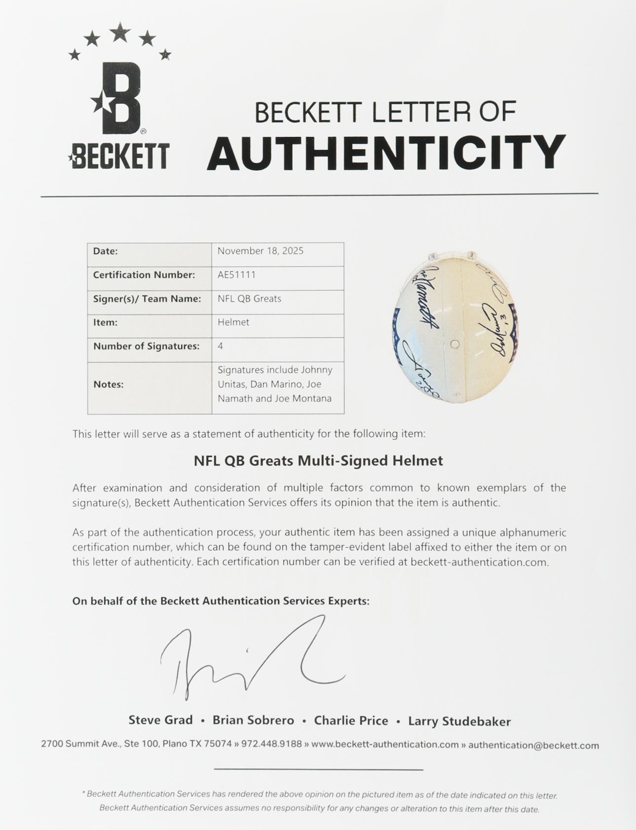 "NFL QB Greats" NFL Shield Logo Authentic Full-Size Helmet Signed By (4) With Johnny Unitas, Dan Marino, Joe Namath & Joe Montana Inscribed "X12" (Beckett)