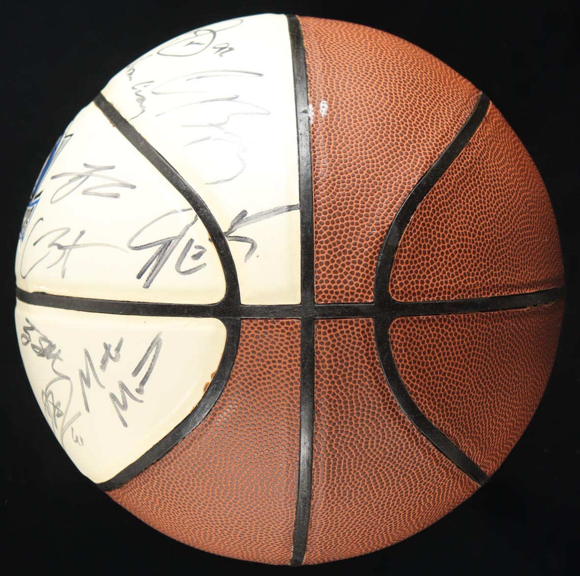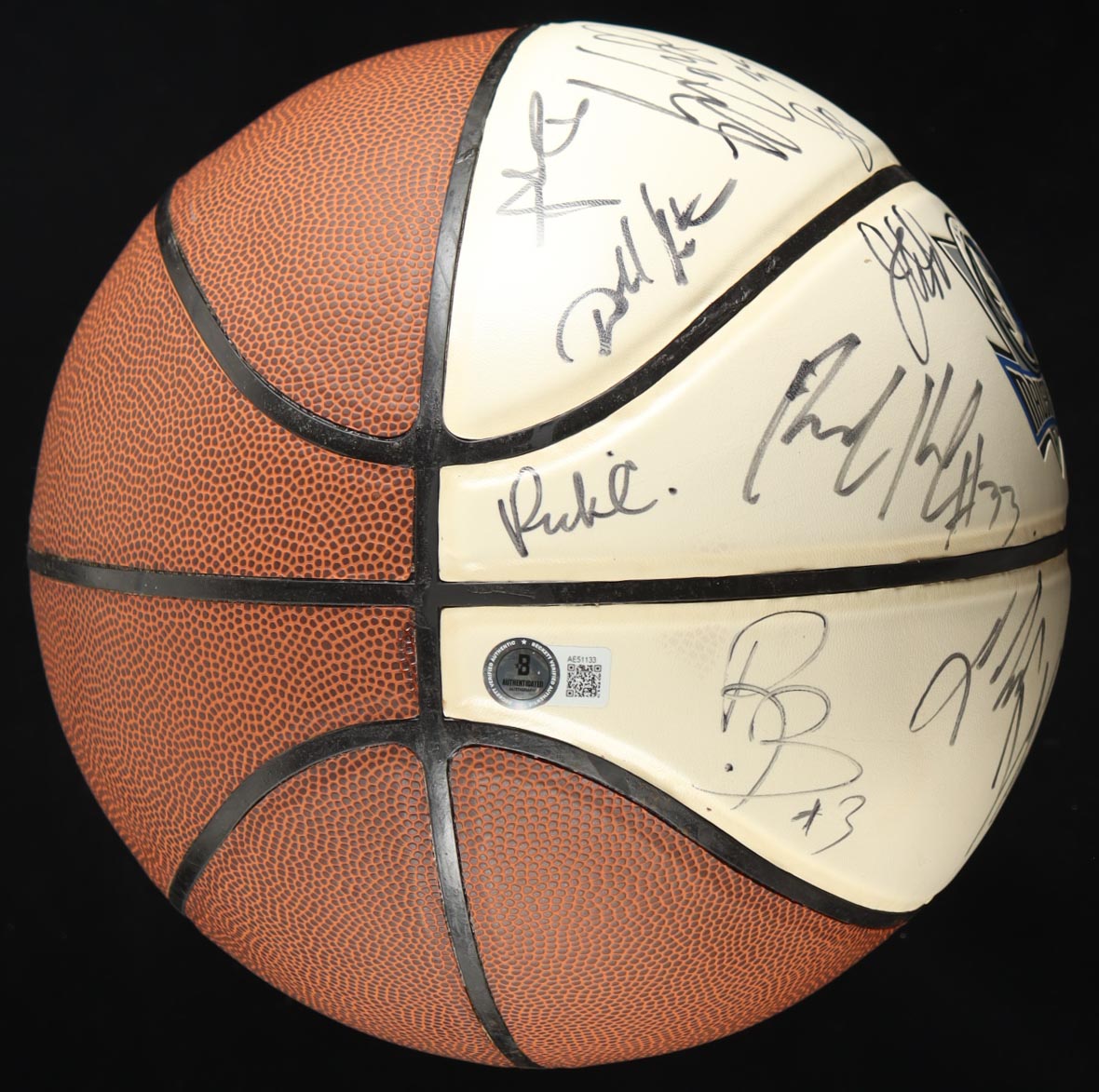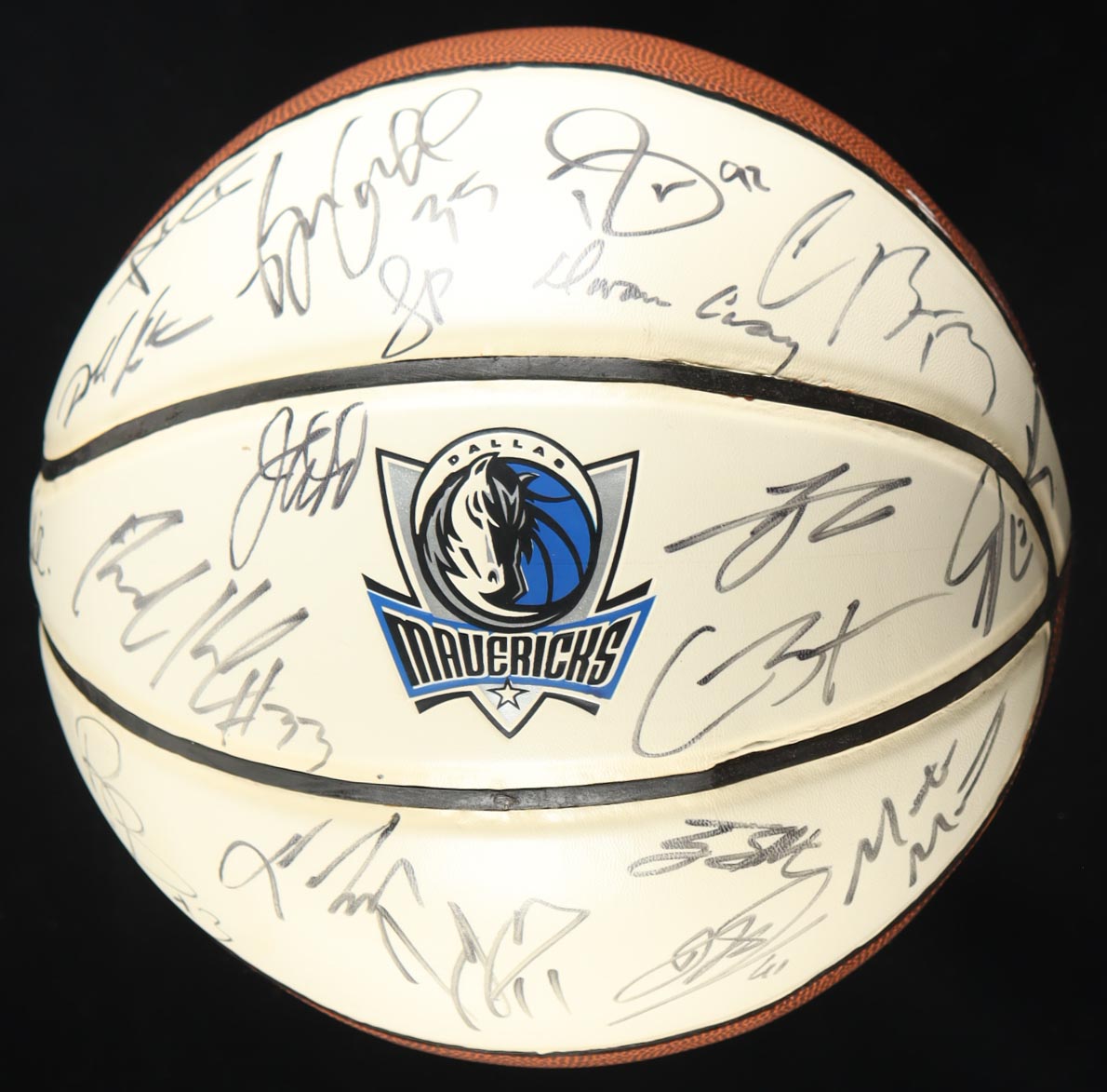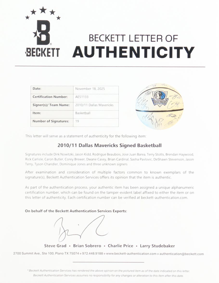 Dallas Mavericks logo basketball. Hand-signed by (19) including Dirk Nowitzki, Jason Kidd, Rodrigue Beaubois, Jose Juan Barea, Terry Stotts, Brendan Haywood, Rick Carliste, Caron Butler, Corey Brewer, Dwane Casey, Brian Cardinal, Sasha Pavlovic, DeShawn Stevenson, Jason Terry, Tyson Chandler, Dominique Jones and (3) others.