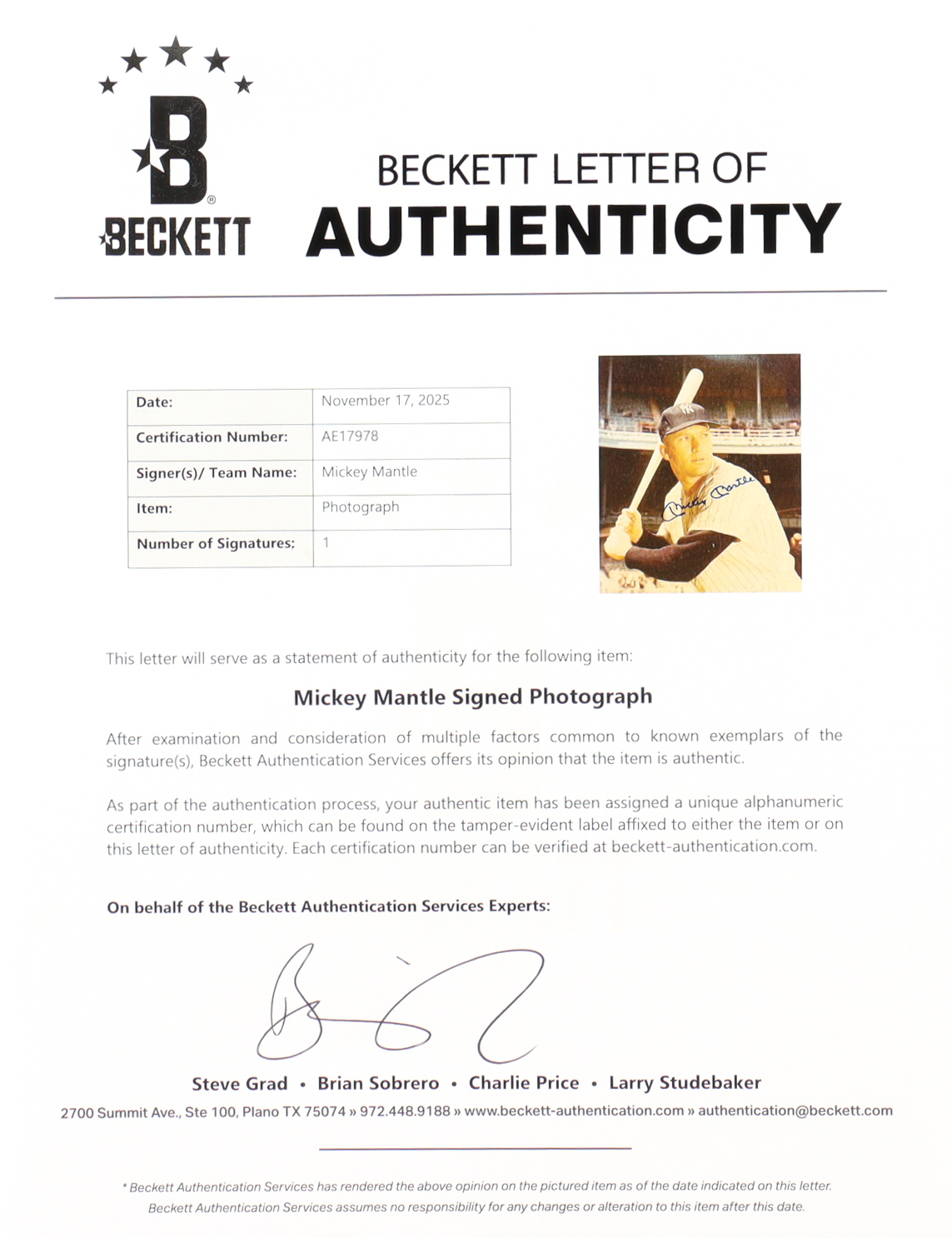 The autograph includes an official Beckett Authentication Services hologram and matching LOA for authenticity purposes.