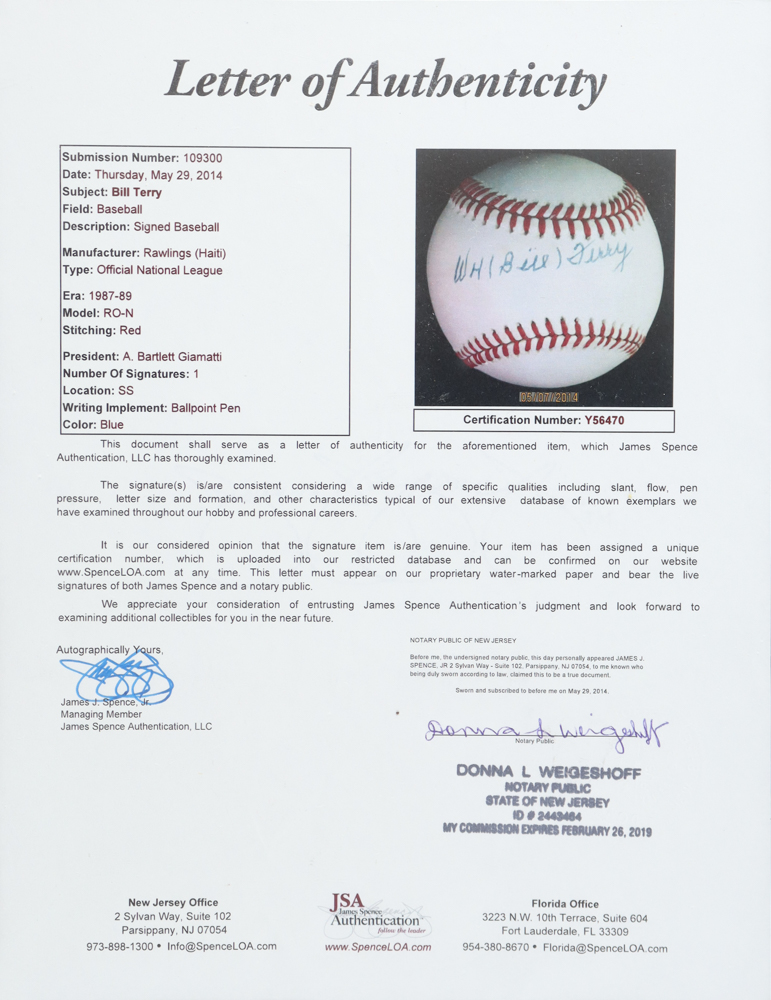 W. H. "Bill" Terry Signed ONL Baseball (JSA & SGC)