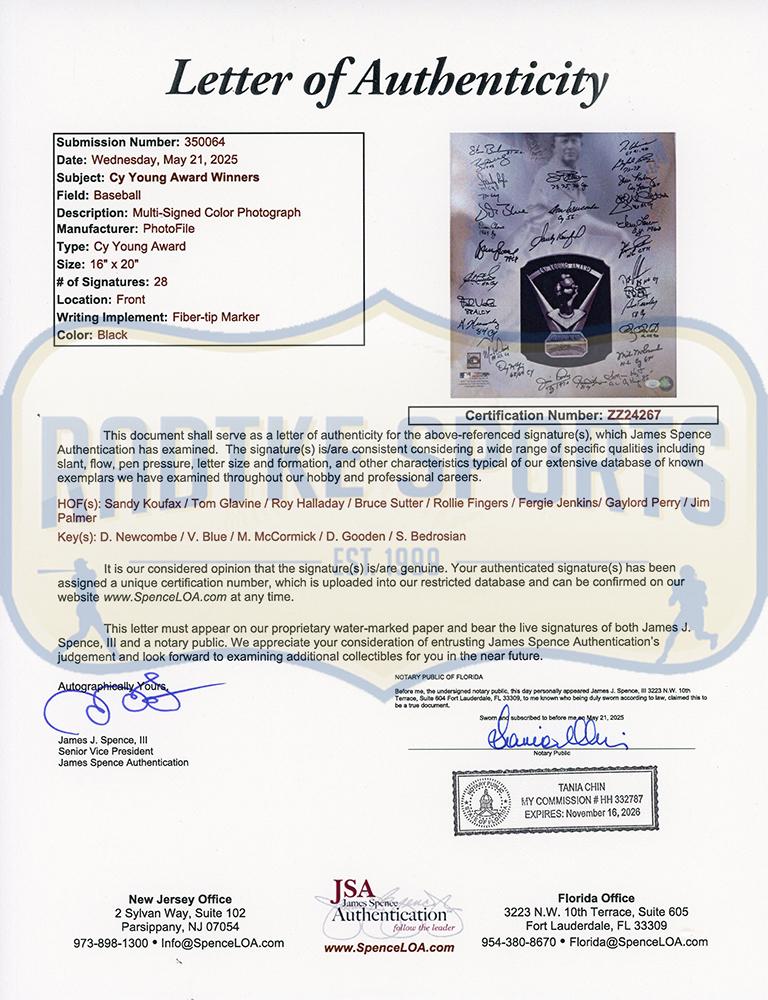 Photo measures 16” x 20” in size and has been hand-signed by (28) Cy Young Award Winners including Sandy Koufax, Tom Glavine, Roy Halladay, Bruce Sutter, Rollie Fingers, Fergie Jenkins, Gaylord Perry, Jim Palmer, Don Newcombe, Vida Blue, Mike McCormick, Doc Gooden, Steve Bedrosian, and (15) others.