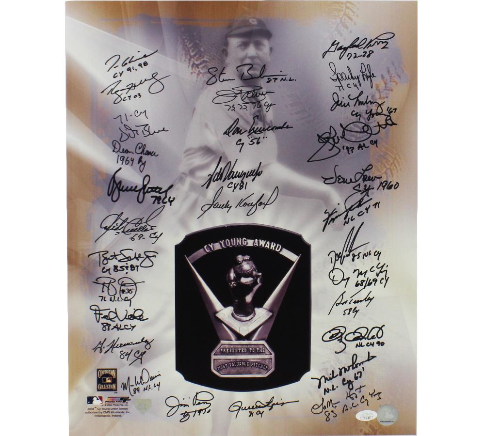 Photo measures 16” x 20” in size and has been hand-signed by (30) Cy Young Award Winners including Sandy Koufax, Tom Glavine, Roy Halladay, Bruce Sutter, Rollie Fingers, Fergie Jenkins, Gaylord Perry, Jim Palmer, Fernando Valenzuela, Don Newcombe, Vida Blue, Mike McCormick, Doc Gooden, Steve Bedrosian, and (16) others.