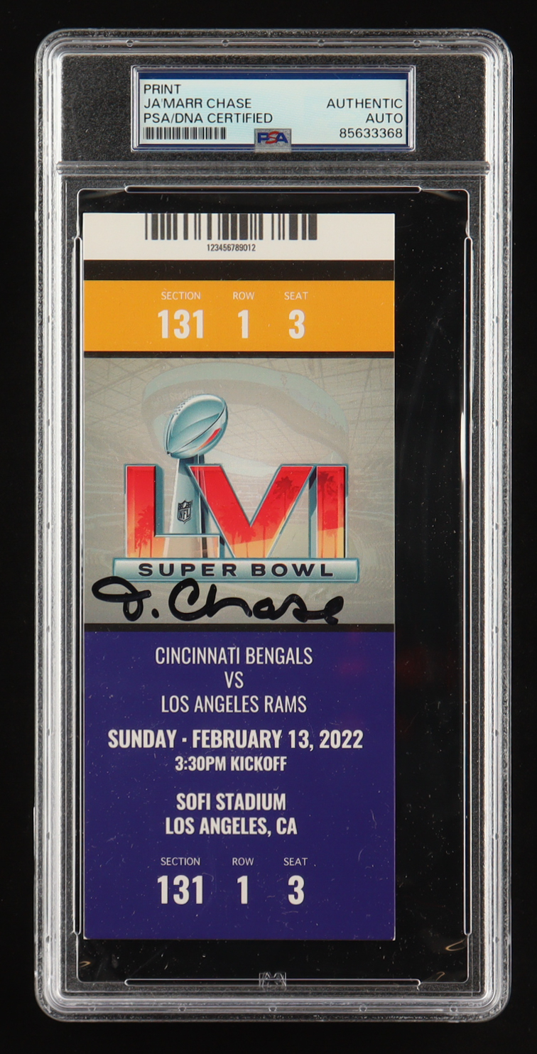 Super Bowl LVI game ticket. Game dated February 13, 2022. Hand-signed by Ja'Marr Chase (Cincinnati Bengals).