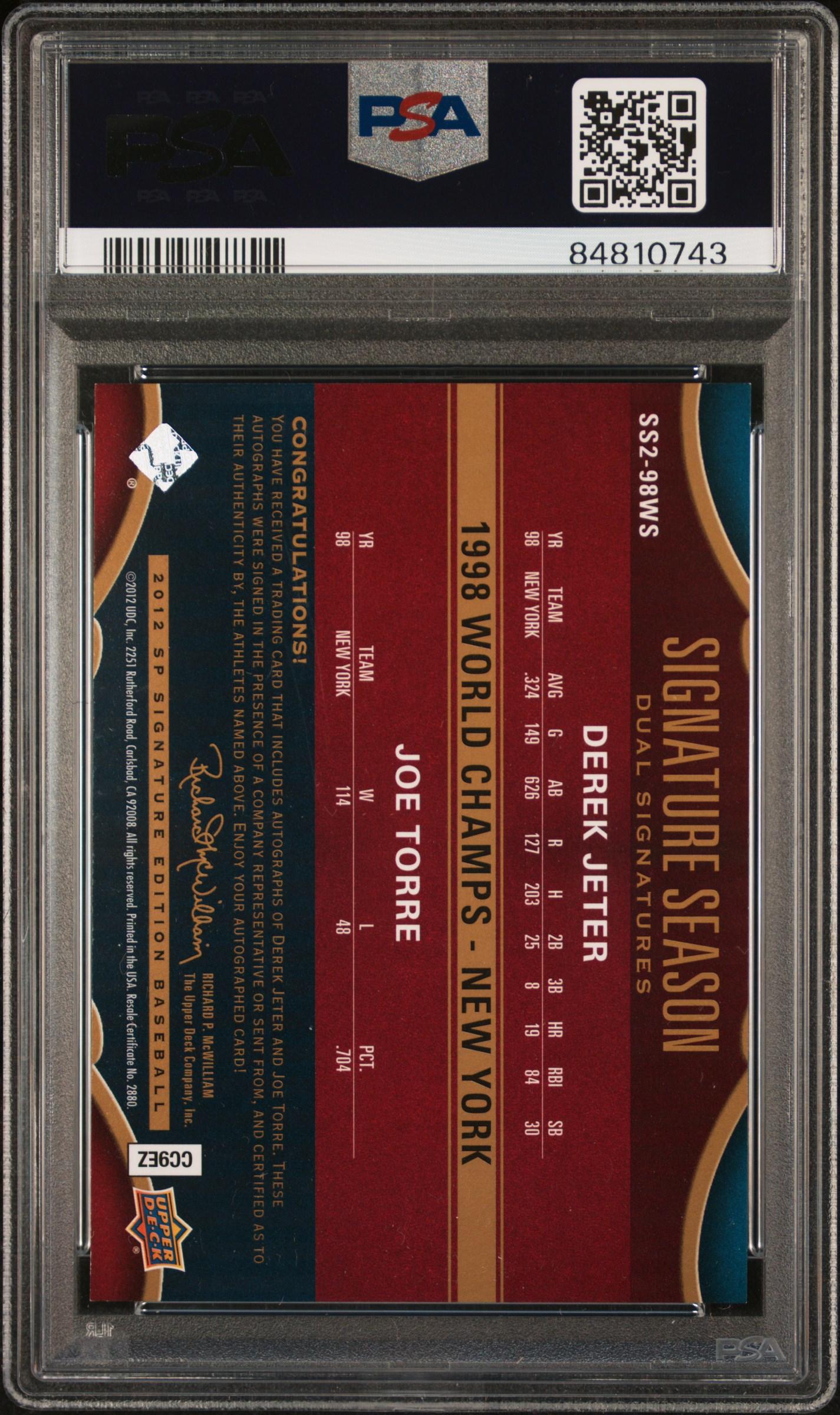 Derek Jeter / Joe Torre 2012 SP Signature Signature Season Signatures Dual #98WS #24/25 (PSA 8 | Auto 9)