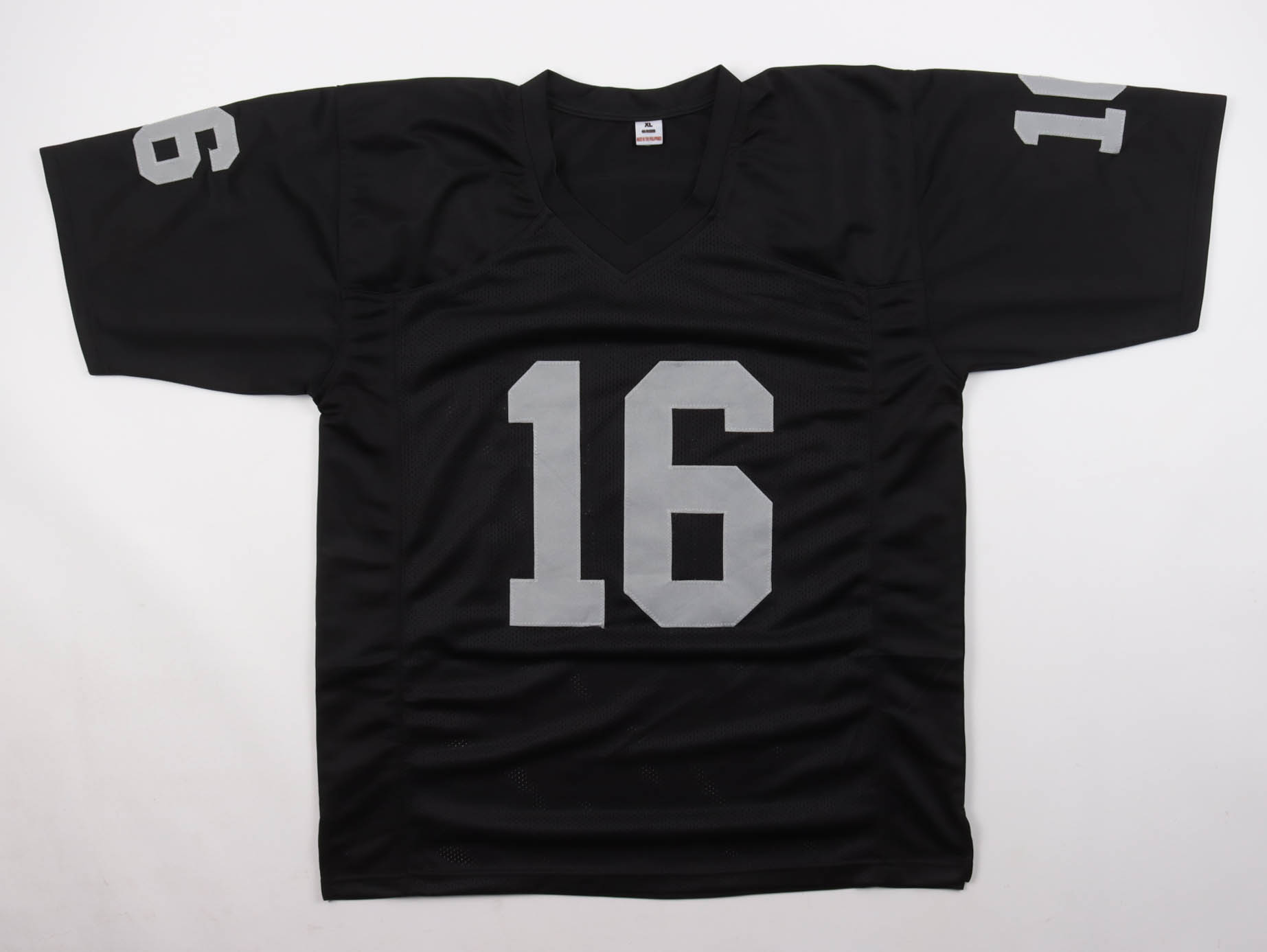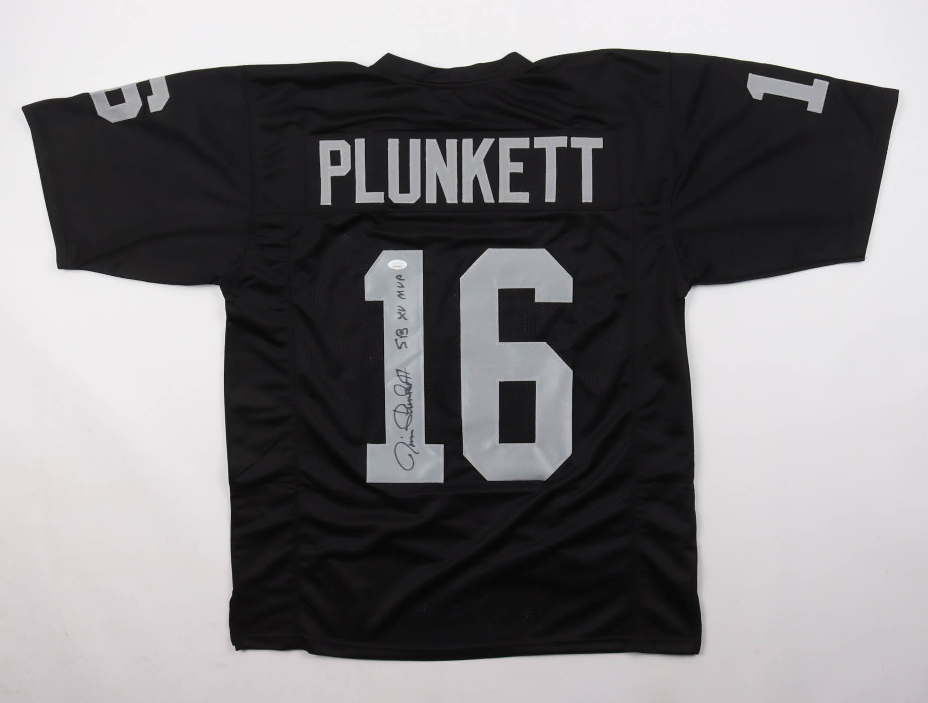 Custom jersey with everything sewn on, size XL. Hand-signed and inscribed by Jim Plunkett (Oakland Raiders).