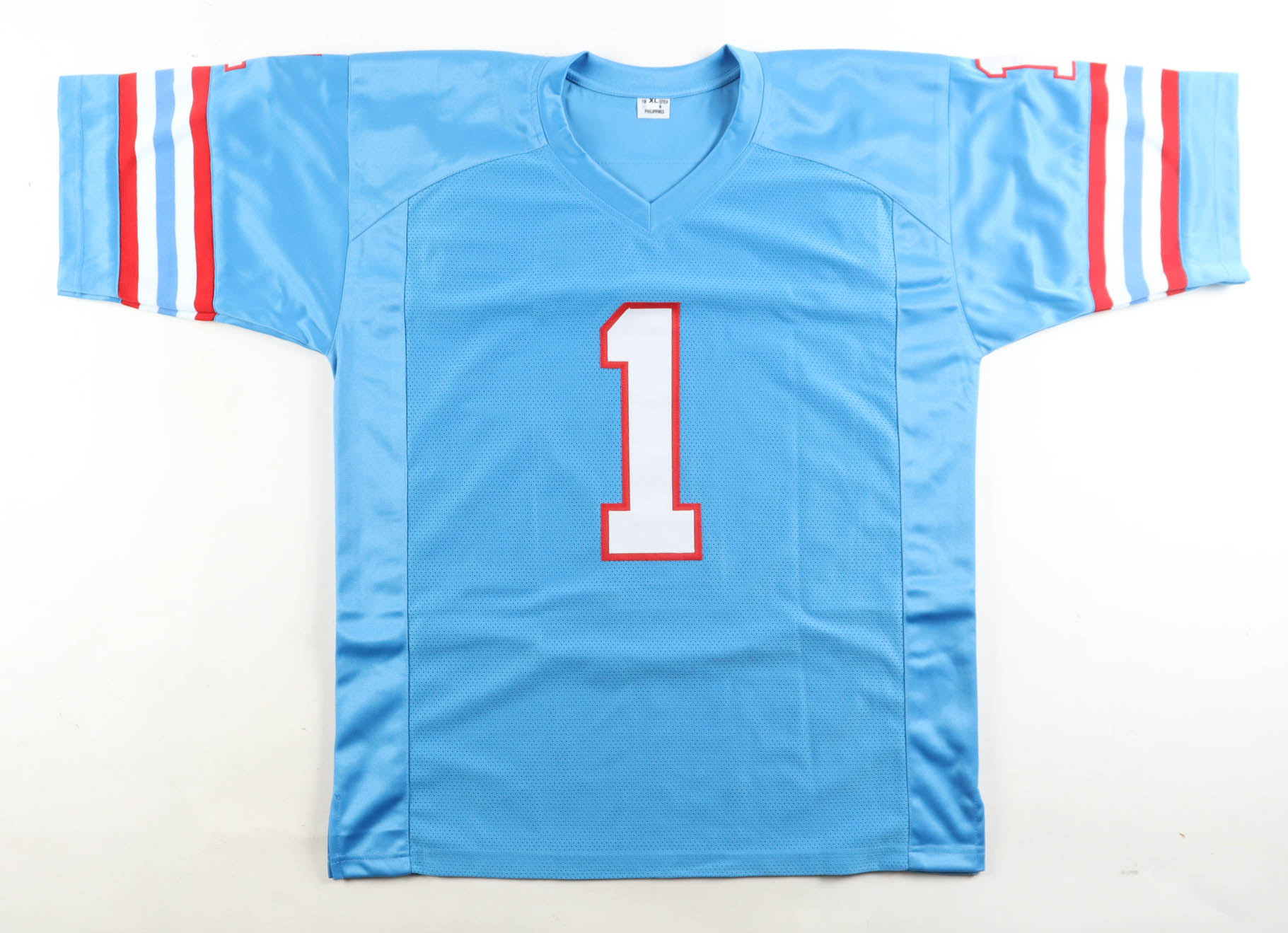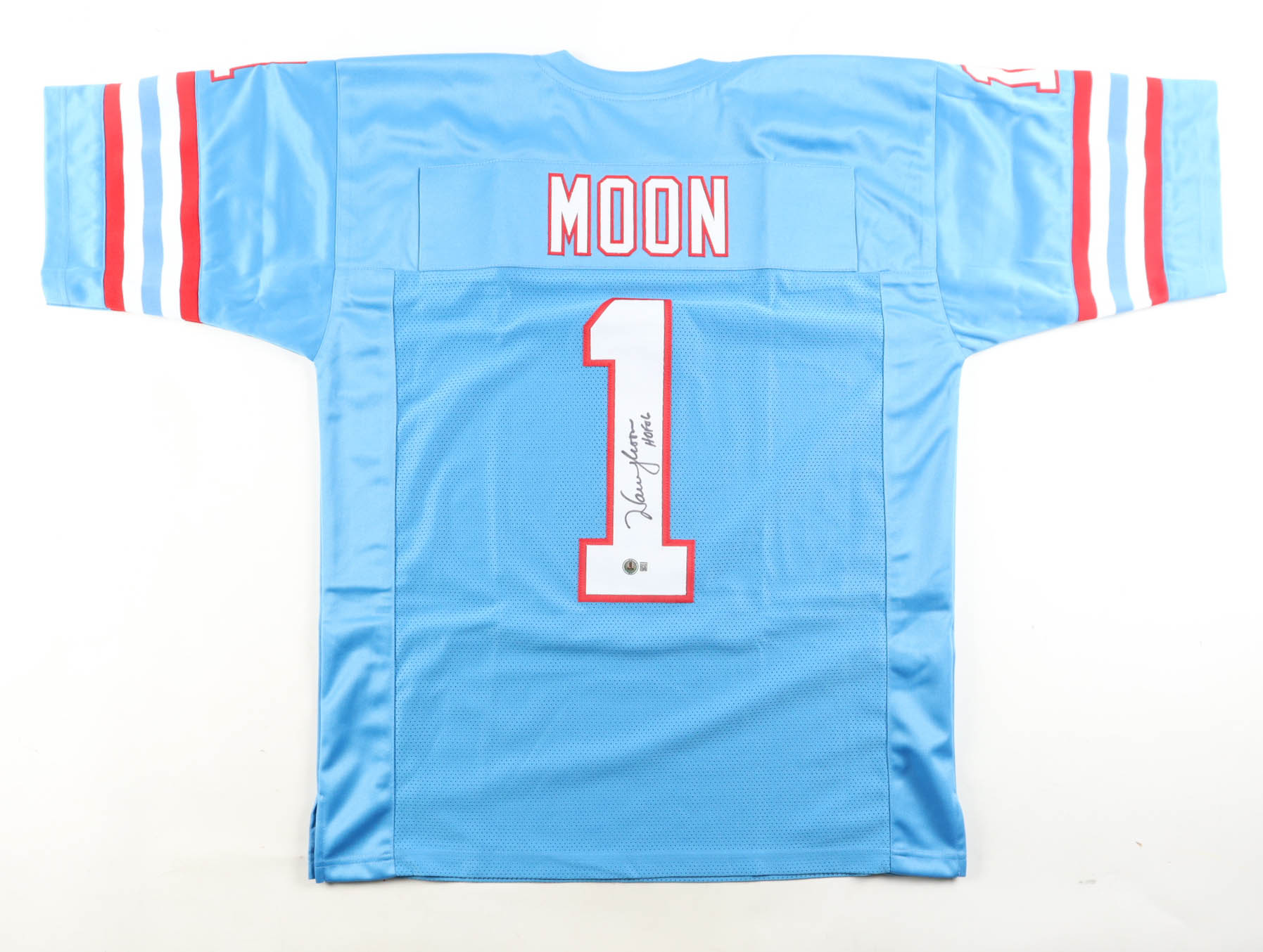 Custom jersey with everything sewn on, size XL. Hand-signed and inscribed by Warren Moon (HOF).