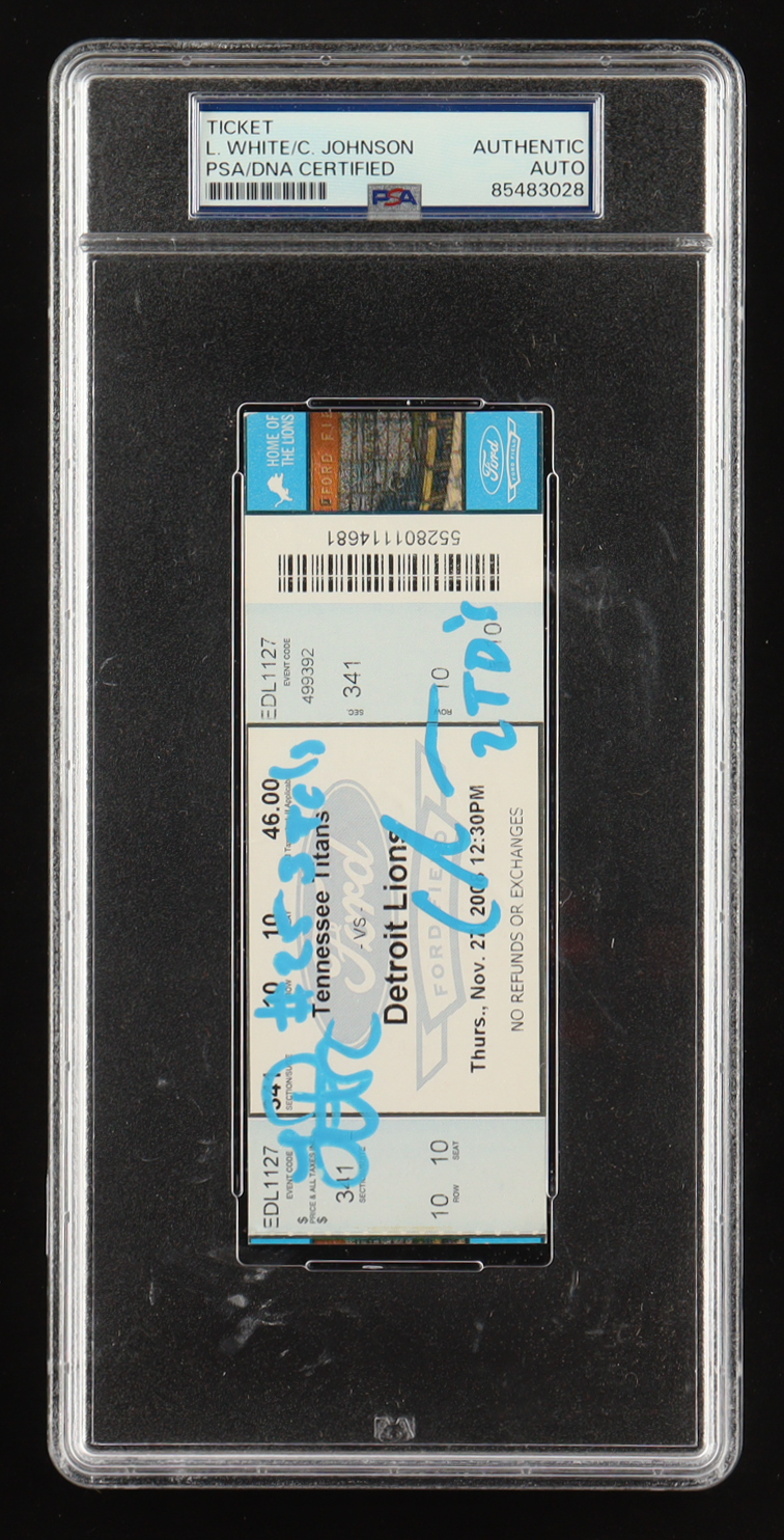 Tennessee Titans vs. Detroit Lions game ticket dated November 27, 2008. Hand-signed by Chris Johnson and LenDale White (Tennessee Titans).