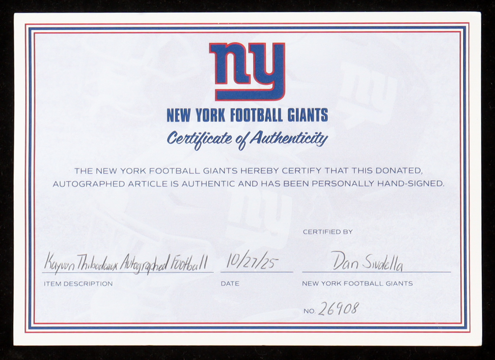 New York Giants logo football. Hand-signed by Kayvon Thibodeaux.