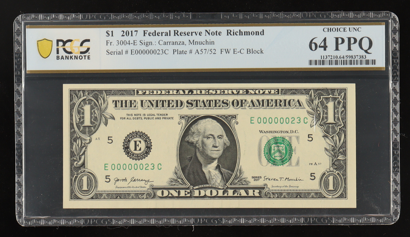2017 U.S. $1 Federal Reserve Note, Richmond - Fr.3004-E Signed: Carranza / Mnuchin (PCGS CHOICE UNC 64PPQ)