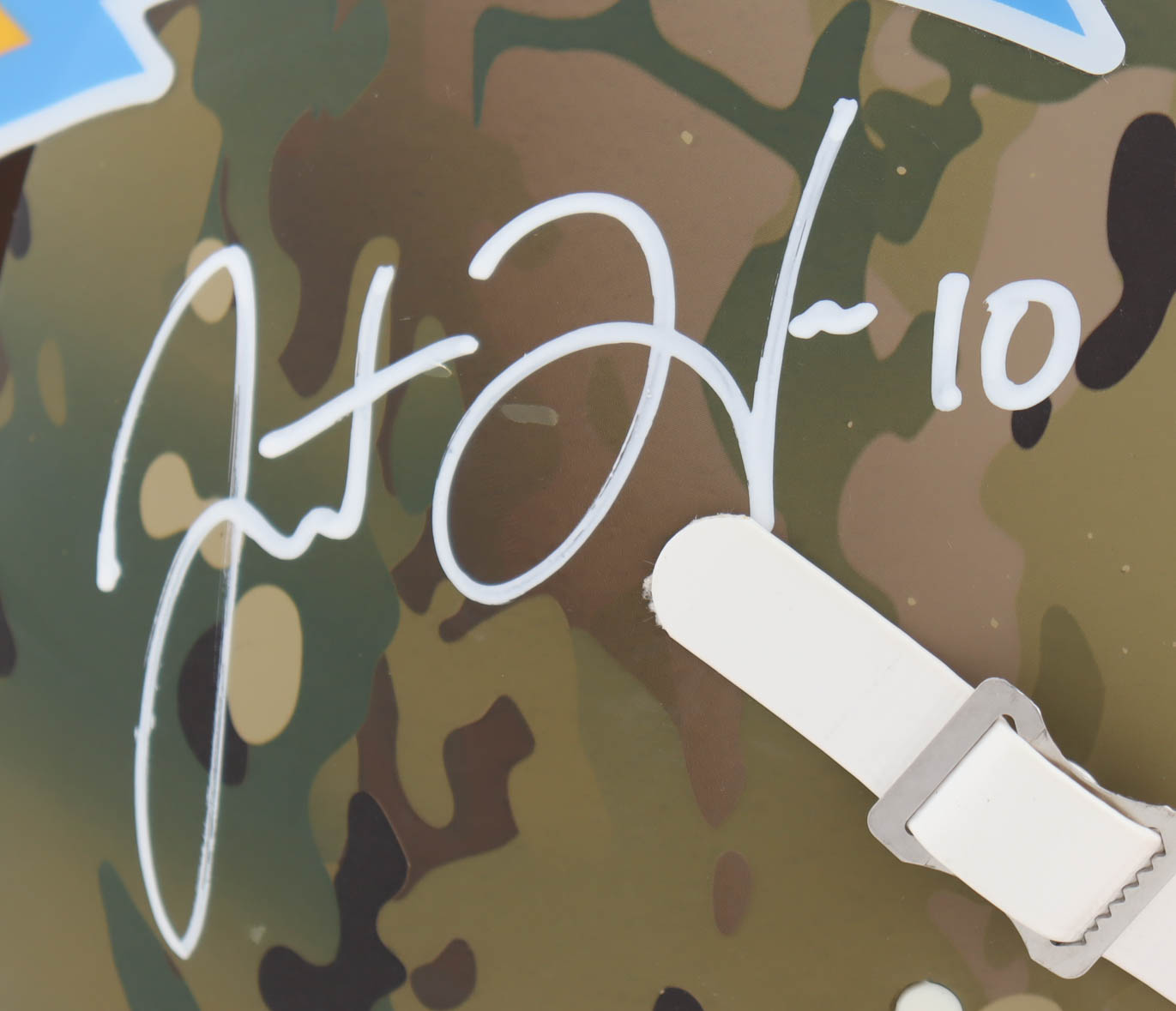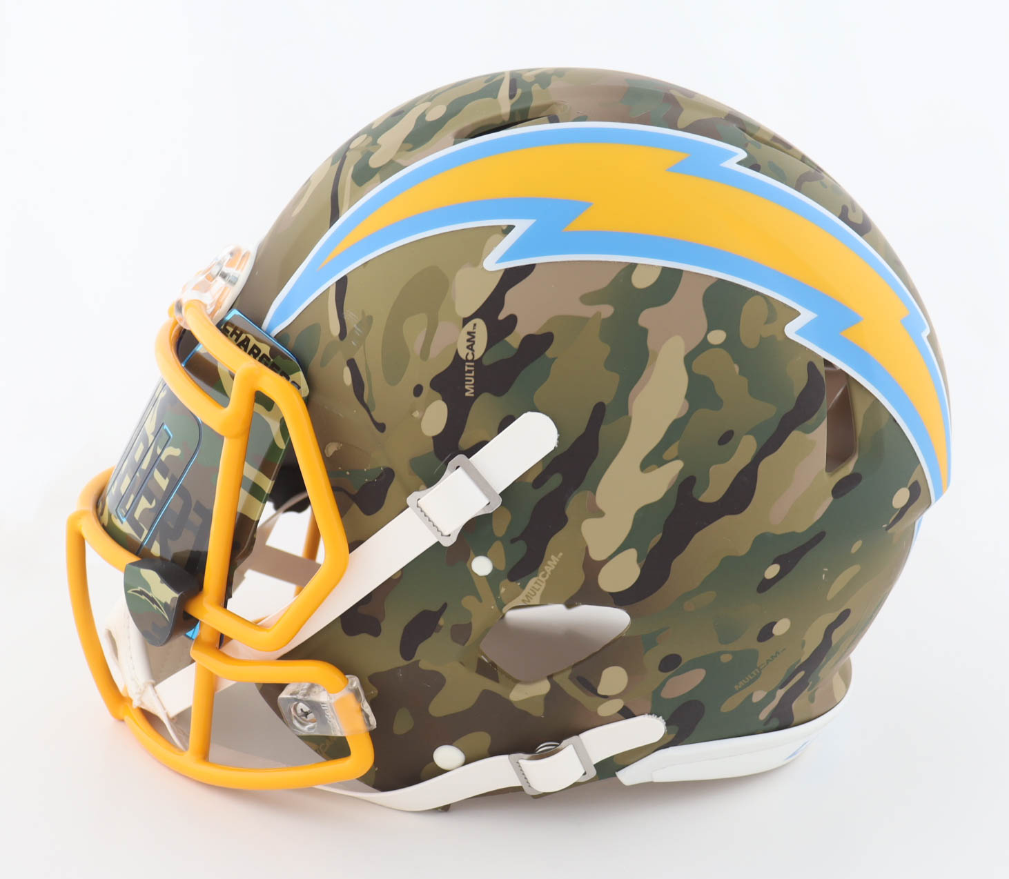 Riddell Los Angeles Chargers full-size authentic on-field camo alternate speed helmet with visor. Hand-signed by Justin Herbert.