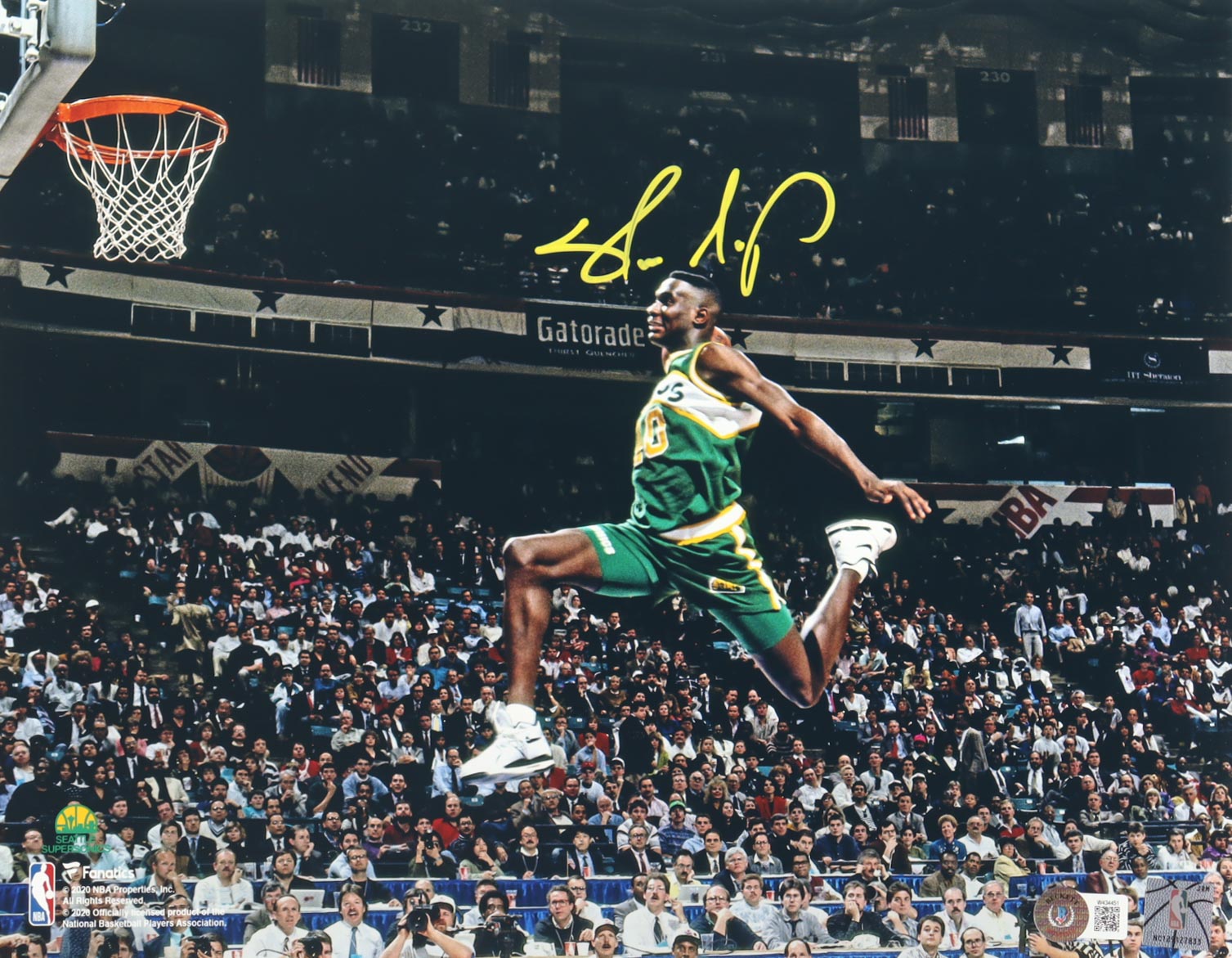 Photo measures approximately 11" x 14" in size. Hand-signed by Shawn Kemp (Seattle SuperSonics).