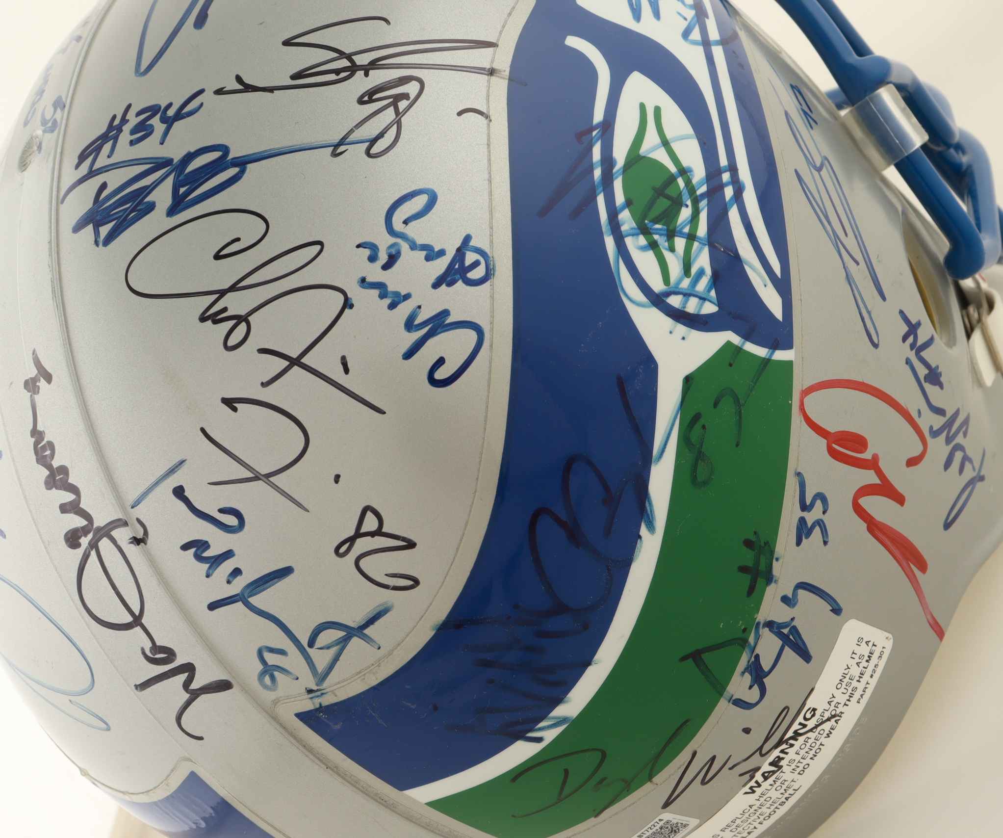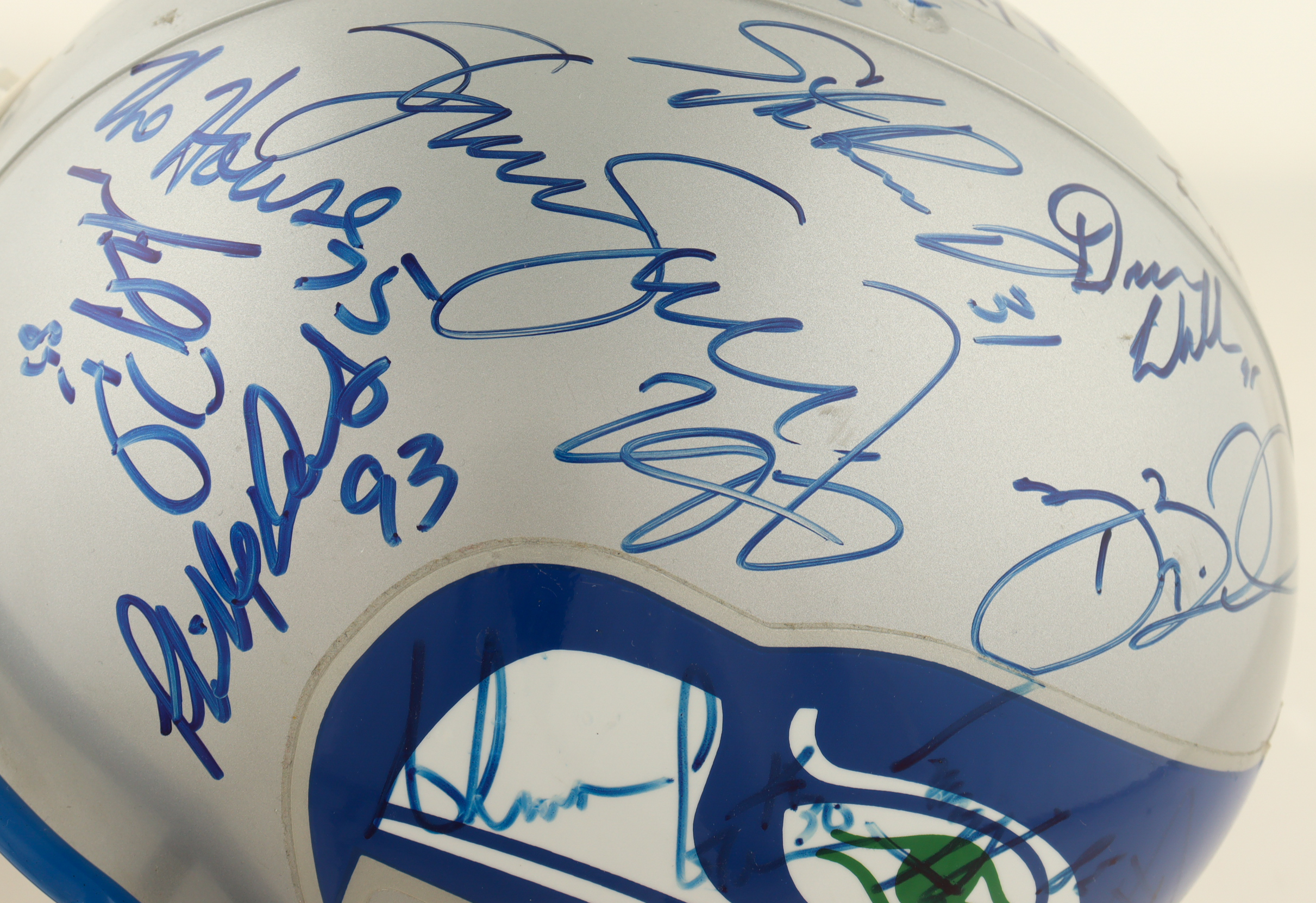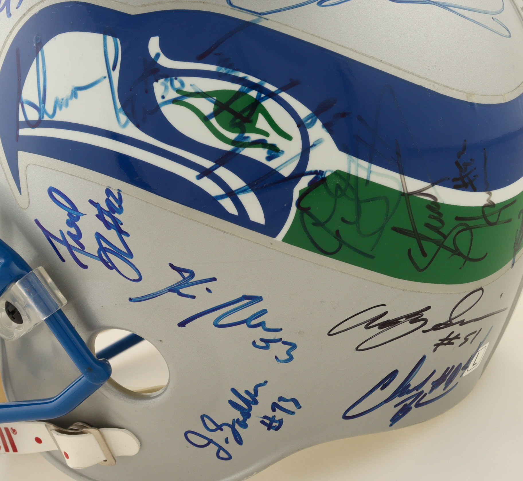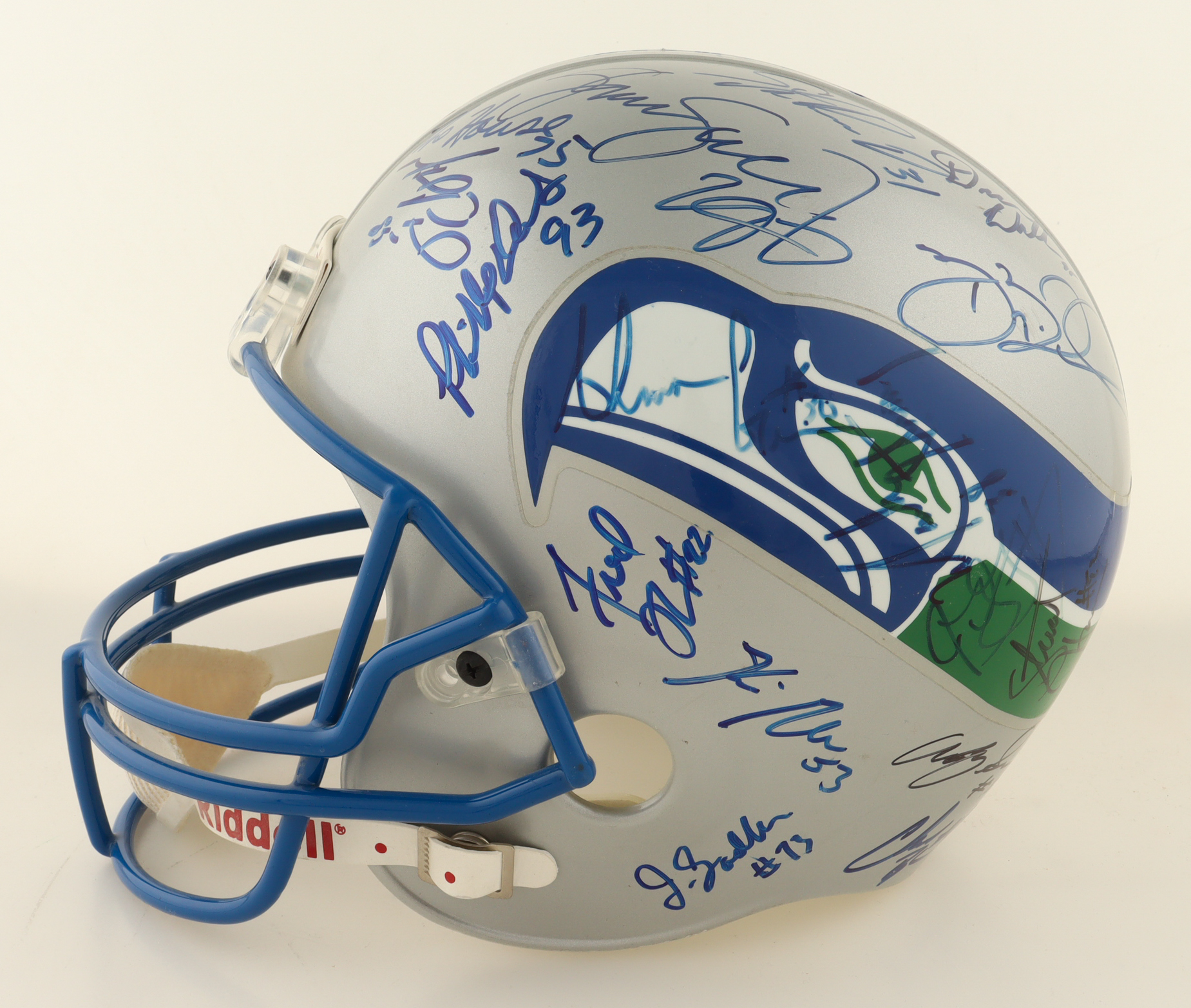 Riddell Seattle Seahawks full-size replica helmet. Hand-signed by (34) with Cortez Kennedy, Ricky Watters, Warren Moon, Shawn Springs, Ahman Green, Phillip Daniels, Jon Kitna, Tony Berti, Fred Thomas, Kevin Glover, Chad Brown, Anthony Simmons, Pete Kendall, Mack Strong, Mike Pritchard, Howard Ballard, Steve Broussard, Dean Wells, Jason McEndoo, Todd Weiner, Reggie Brown, Carlester Crumper, Darryl Williams, James McKnight, Christian Fauria, Sam Adams, Chris Gray and (7) others.