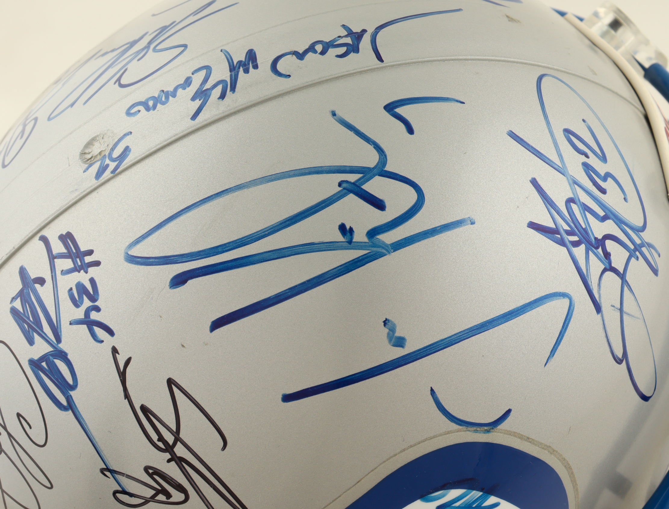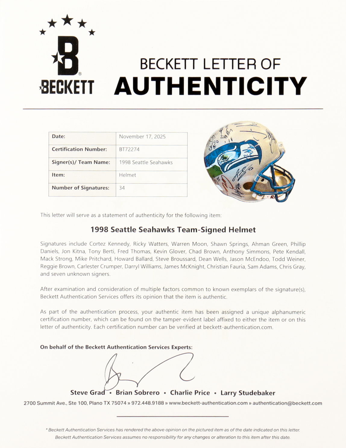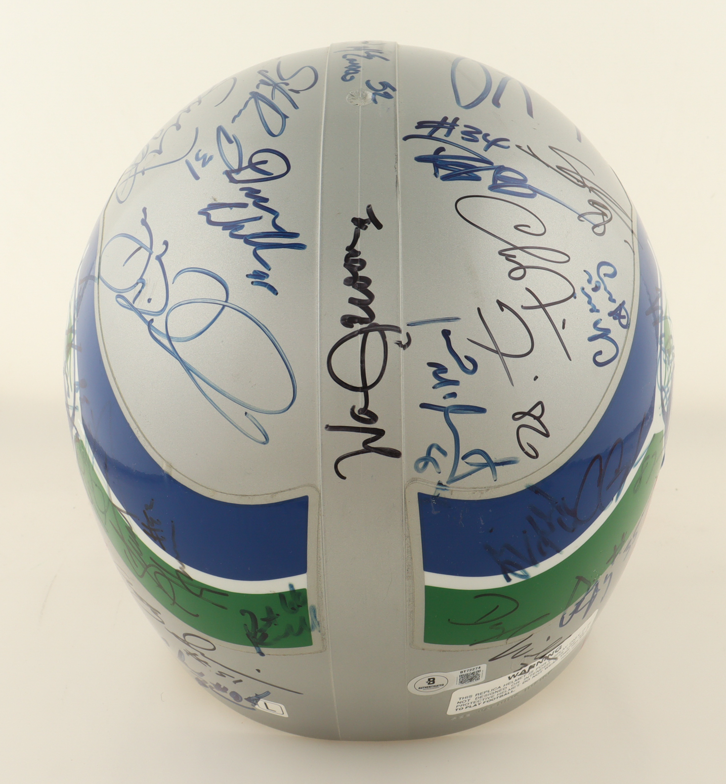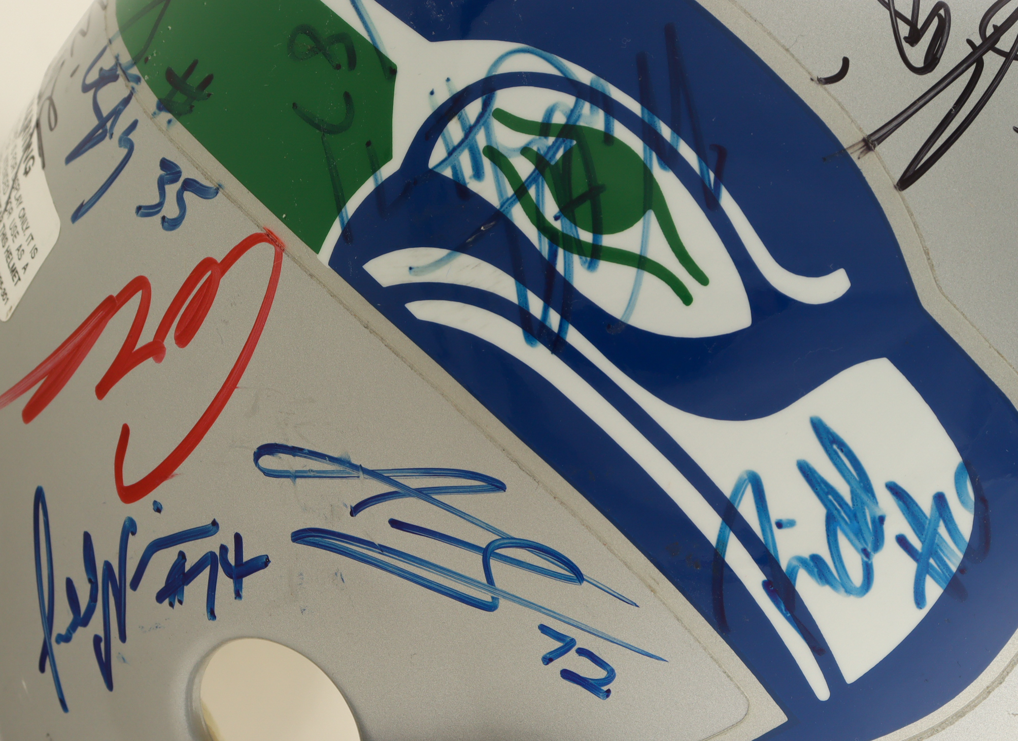 Riddell Seattle Seahawks full-size replica helmet. Hand-signed by (34) with Cortez Kennedy, Ricky Watters, Warren Moon, Shawn Springs, Ahman Green, Phillip Daniels, Jon Kitna, Tony Berti, Fred Thomas, Kevin Glover, Chad Brown, Anthony Simmons, Pete Kendall, Mack Strong, Mike Pritchard, Howard Ballard, Steve Broussard, Dean Wells, Jason McEndoo, Todd Weiner, Reggie Brown, Carlester Crumper, Darryl Williams, James McKnight, Christian Fauria, Sam Adams, Chris Gray and (7) others.