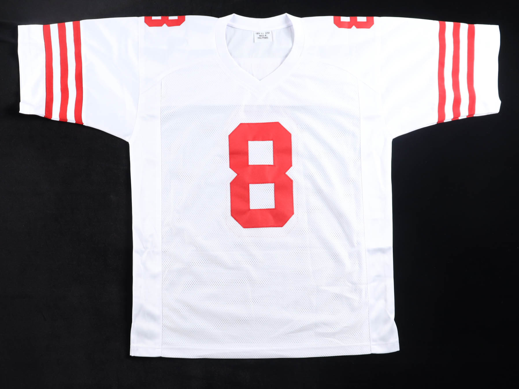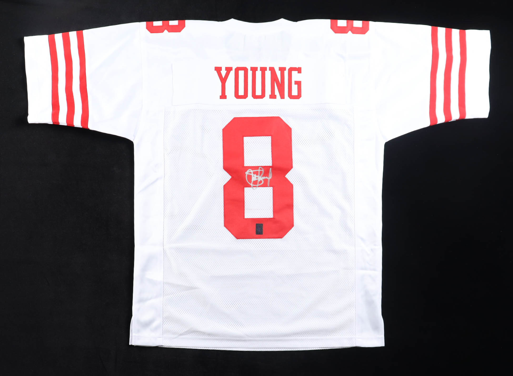 Custom jersey with everything sewn on, size XL. Hand-signed by Steve Young (HOF). Please note, there is staining on the name plate.