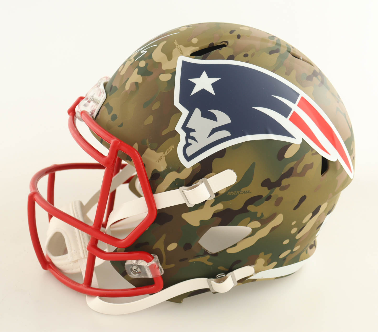 Riddell New England Patriots Full-Size Camo Alternate Speed replica helmet. Hand-signed by Matthew Judon.
