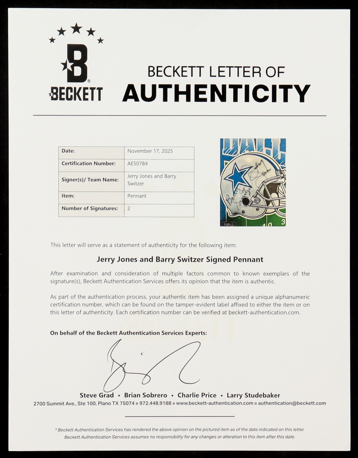 Dallas Cowboys pennant flag measures approximately 12" x 30" in size and has been hand-signed by Jerry Jones (Owner, President and General Manager, Dallas Cowboys) and Barry Switzer (Headcoach). Please see photo for more details regarding the condition of the flag.