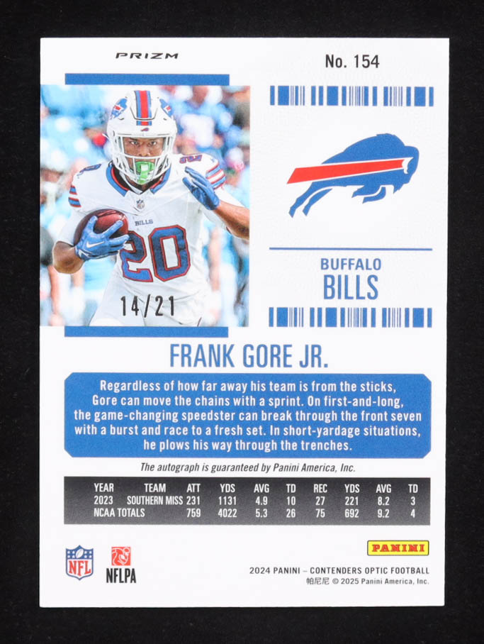 Frank Gore Jr. 2024 Panini Contenders Optic Purple Pulsar Autograph #154 RC #14/21