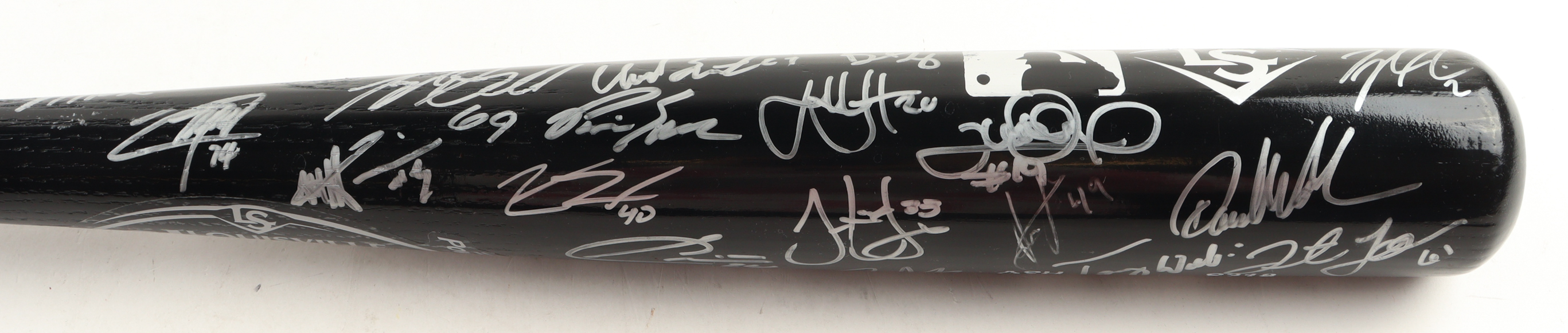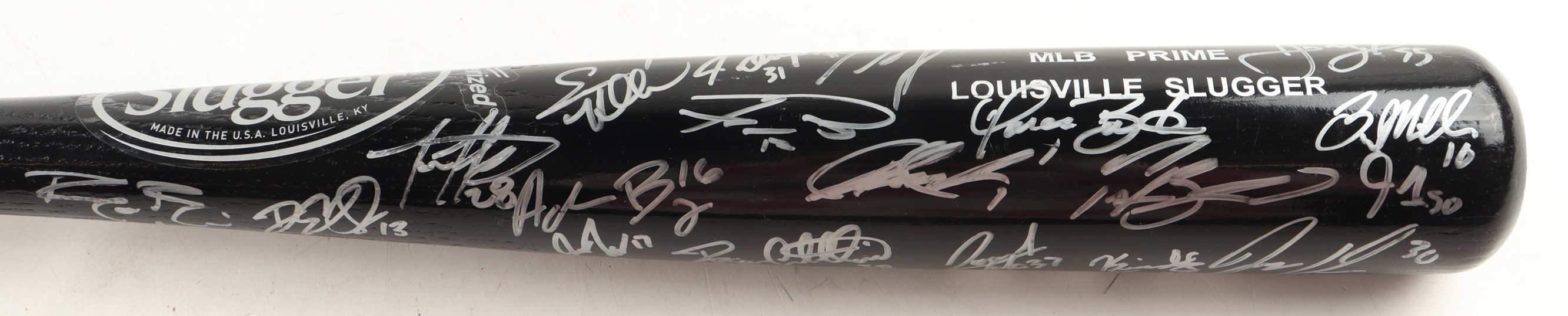 Louisville Slugger MLB Prime baseball bat. Hand-signed by (34) with include Ryan Castellani, Chad Smith, Dave Burba, Shelley Duncan, Daulton Varsho, Tyler Nevin, Sam Hilliard, Jazz Chisholm, Drew Ellis, Griffin Jax, Kevin Ginkel, Travis Blankenhorn, and Jon Duplantier and (21) others. Please note, there is some scuffing on the bat.
