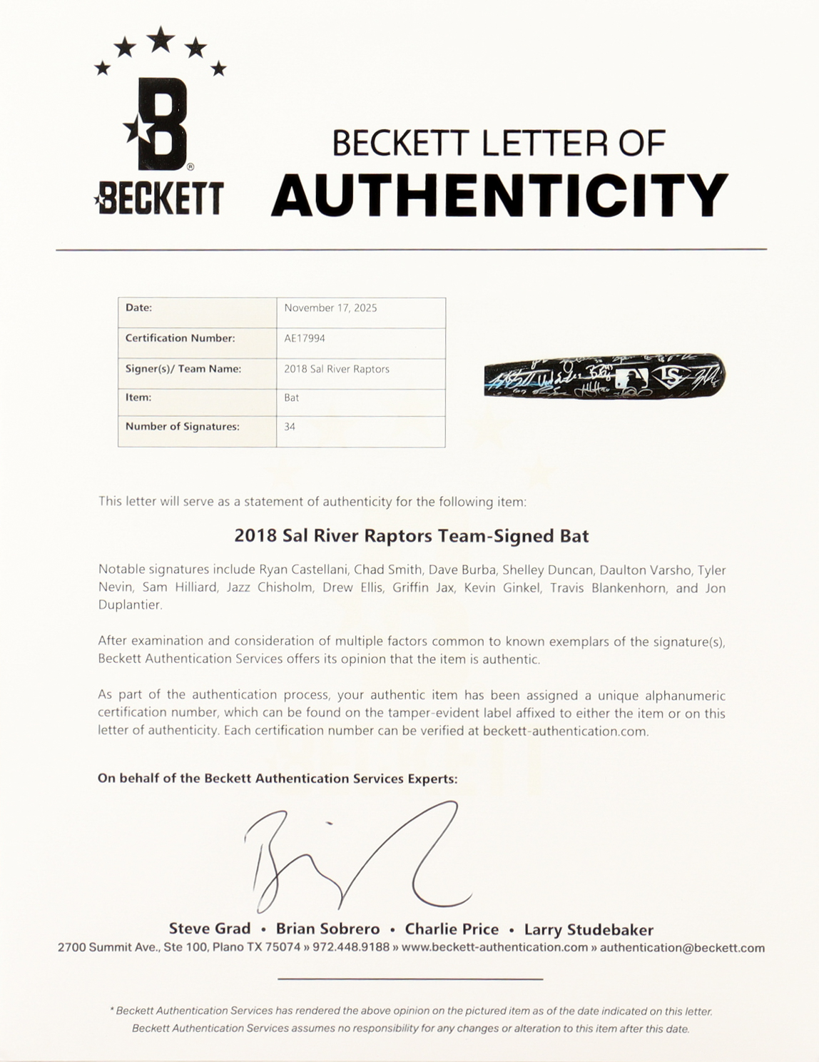 The autograph includes an official Beckett Authentication Services hologram and matching LOA for authenticity purposes.