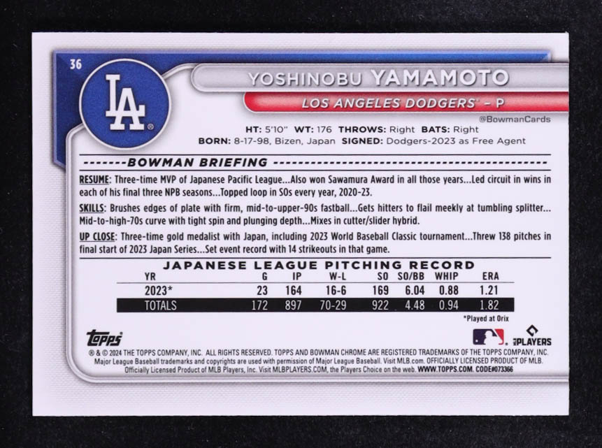 Yoshinobu Yamamoto 2024 Bowman Chrome Bowman Mega Box Purple Refractors #36 #215/250 RC