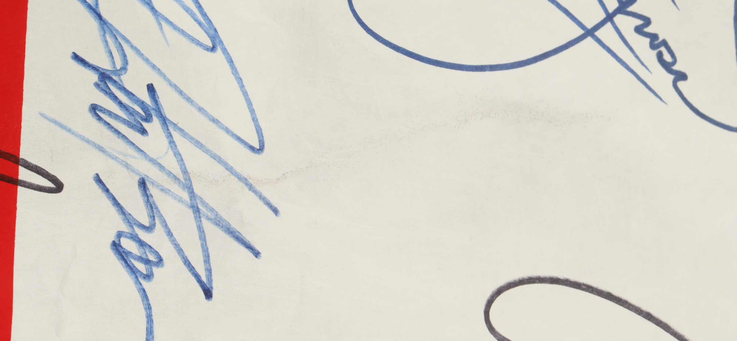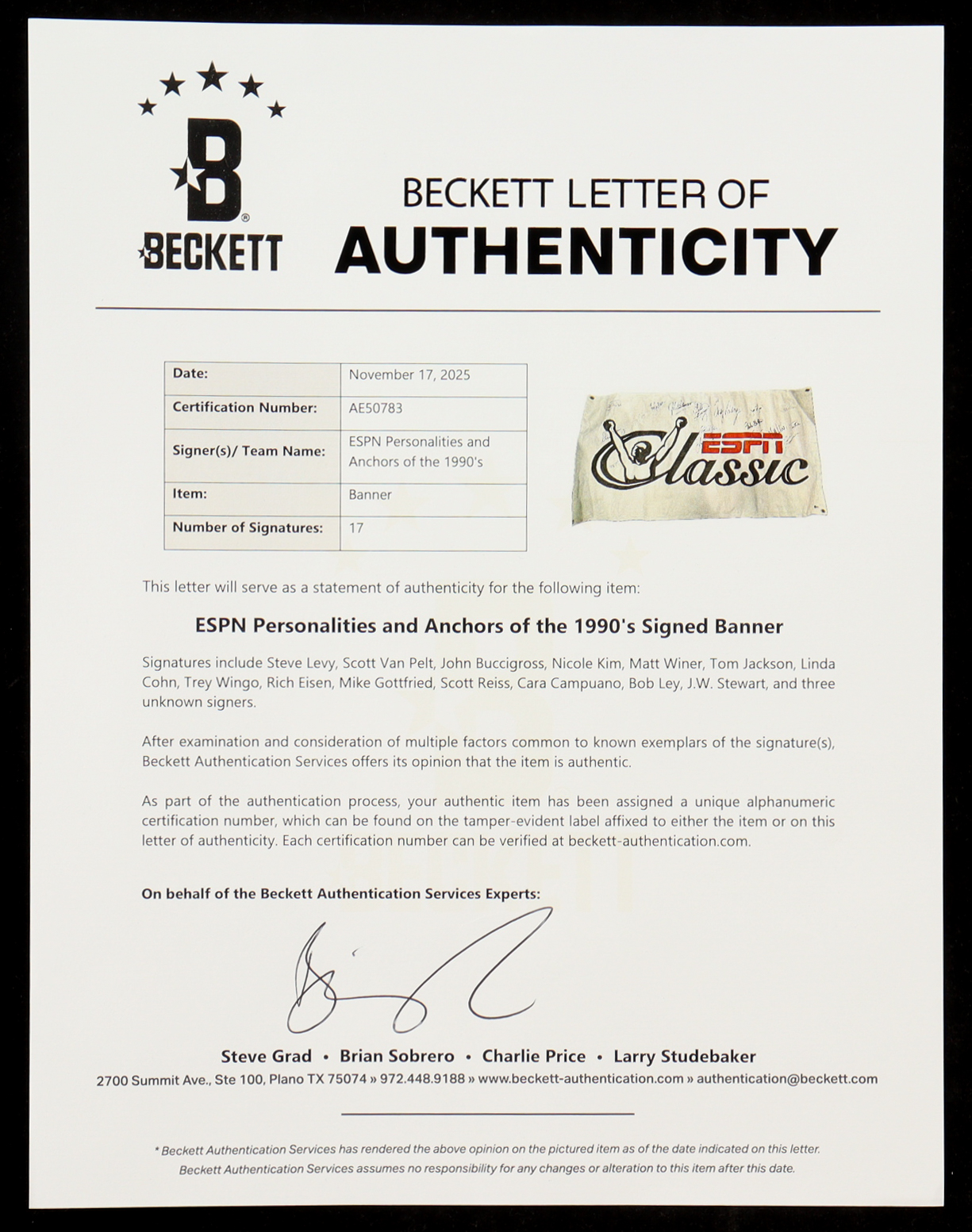 Banner measures 31" x 57" and features an ESPN Classic logo. Banner has been hand-signed on the front by (17) 1990's ESPN personalities and anchors with Steve Levy, Scott Van Pelt, John Buccigross, Nicole Kim, Matt Winer, Tom Jackson, Linda Cohn, Trey Wingo, Rich Eisen, Mike Gottfried, Scott Reiss, Cara Campuano, Bob Ley, J.W. Stewart, and three unknown signers. Please note the banner is stained and creased throughout, see photos for more details.