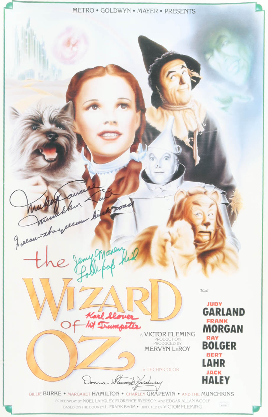 Poster measures approximately 16" x 24" in size and has been hand-signed and inscribed by Mickey Carroll (D. 2009), Jerry Maren (D. 2018), Karl Slover (D. 2011), and Donna Stewart Hardway (D. 2008).