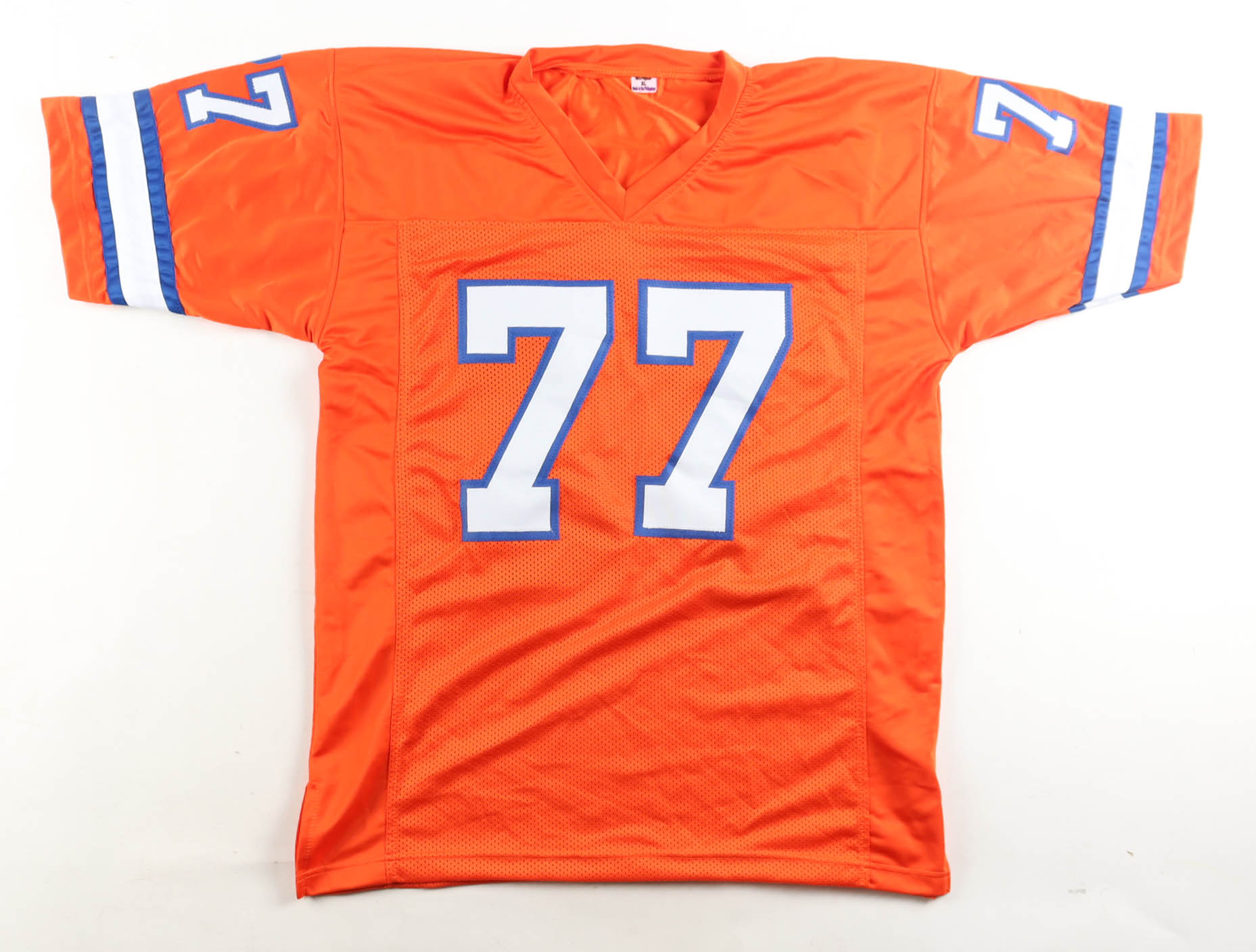 Custom jersey with everything sewn on, size XL. Hand-signed and inscribed by Karl Mecklenburg. Please note, the signature and inscription have bled.