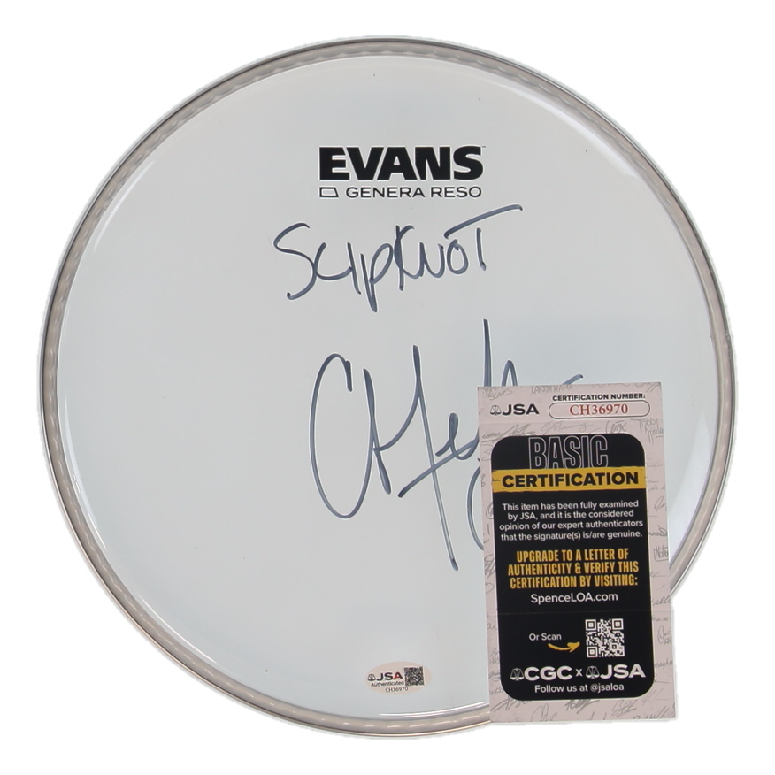 Drumhead measures approximately 8" in diameter and has been hand-signed by Chris Fehn.