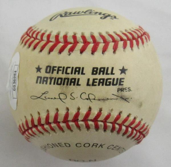 Rawlings Official National League Baseball. Hand-signed by Stan Musial (D. 2013, St. Louis Cardinals, HOF). Please note, the baseball is naturally toned and stained throughout.
