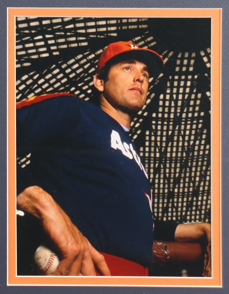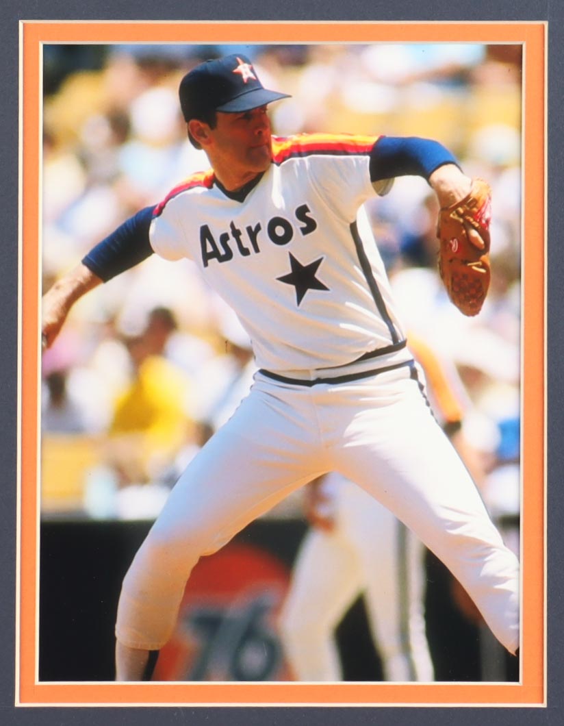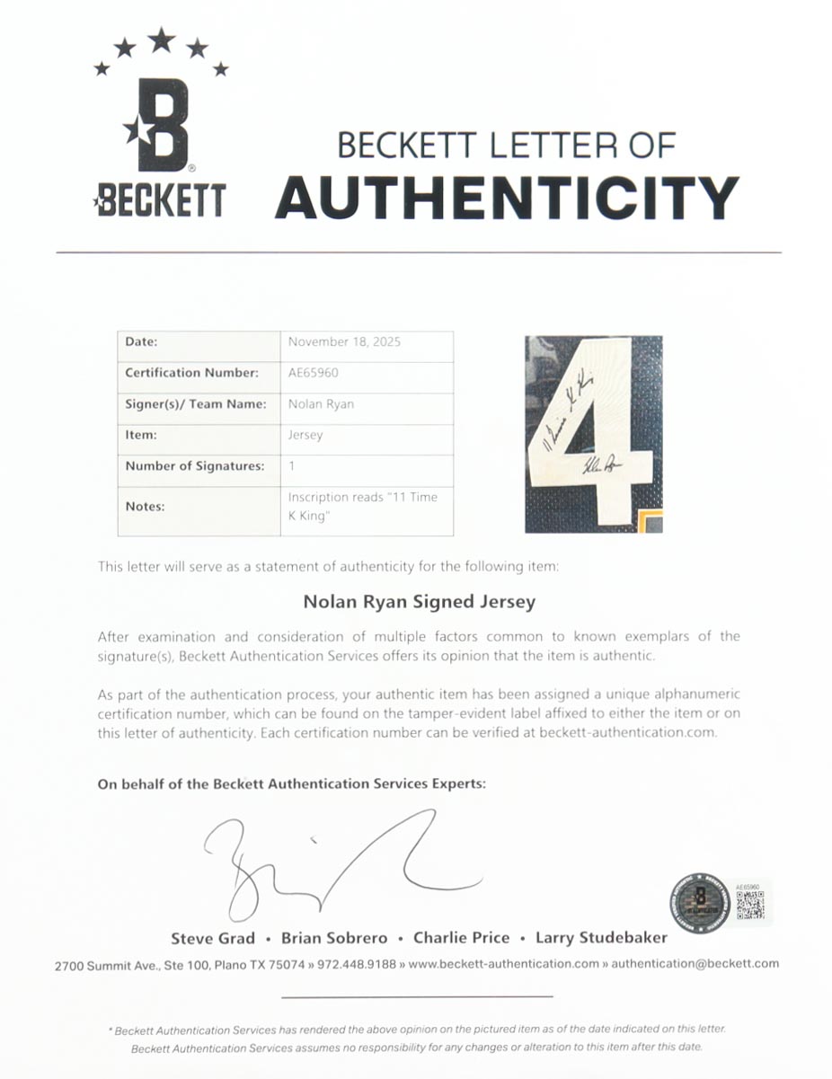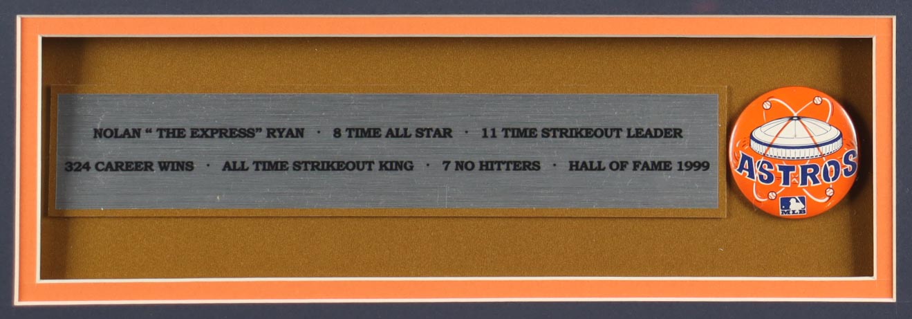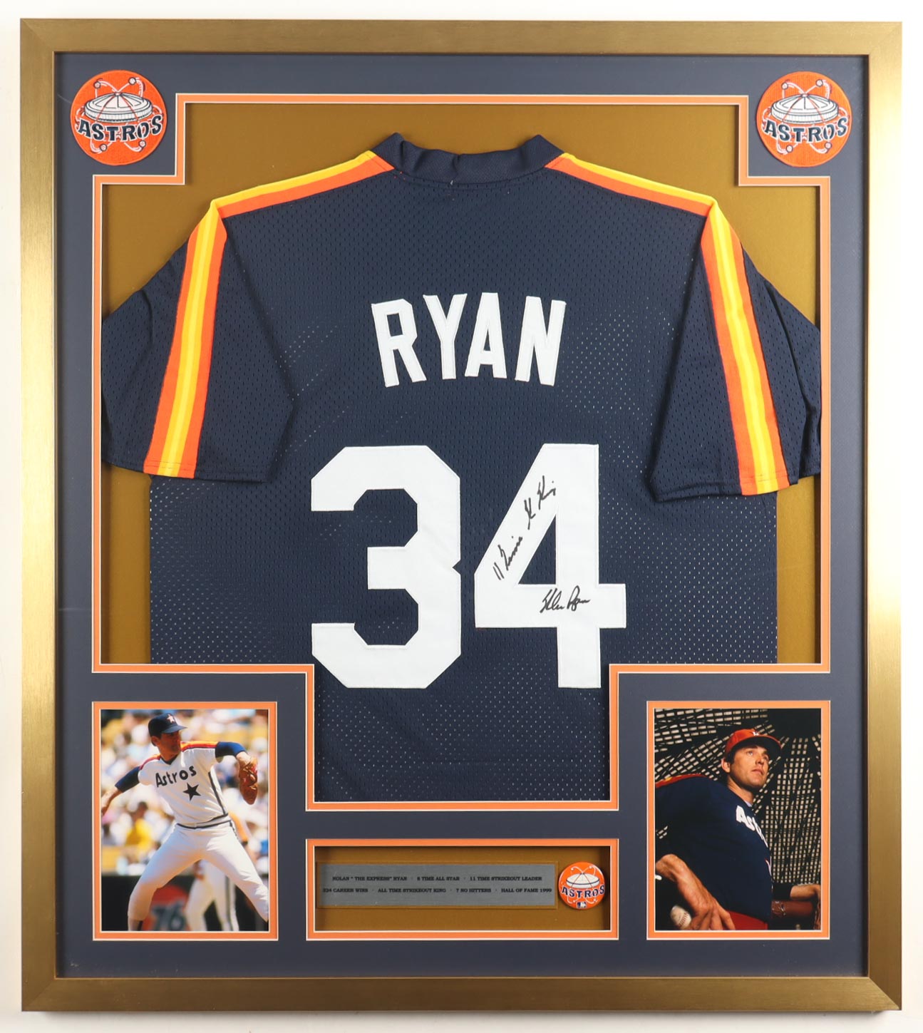 Custom frame measures approximately 32" x 36" in size and features a jersey that has been hand-signed and inscribed by Nolan Ryan (HOF).