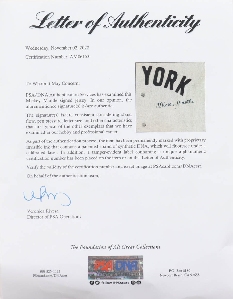 Mitchell & Ness jersey with everything sewn on, size XL, has been hand-signed by Mickey Mantle (D. 1995, New York Yankees, HOF). Please note, there is staining throughout the jersey. See photos regarding the condition of the item.