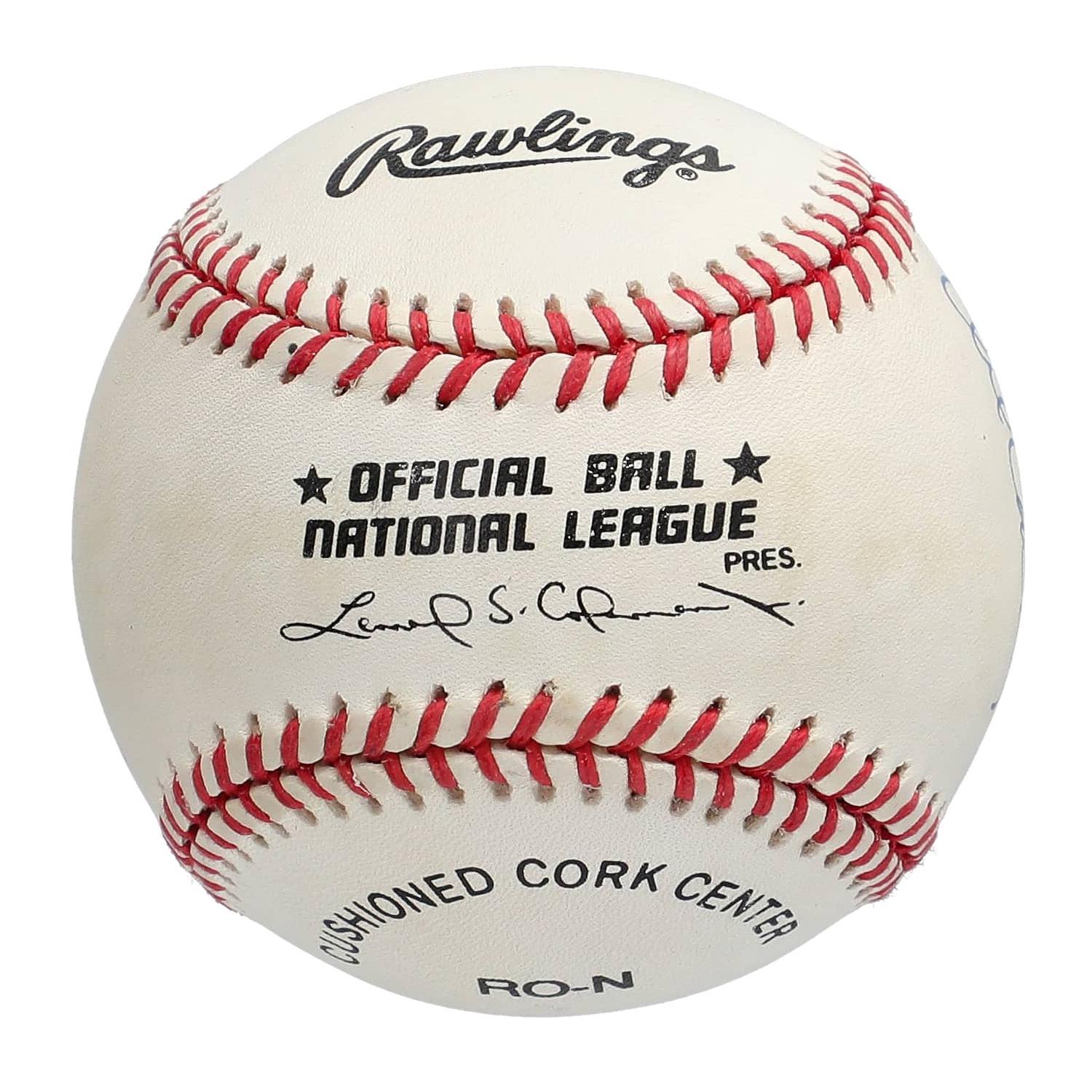 Rawlings Official National League Baseball. Hand-signed and inscribed by Harry Caray (D. 1998, Chicago Cubs, HOF), Chip Caray (St. Louis Cardinals) and Skip Caray (Atlanta Braves).