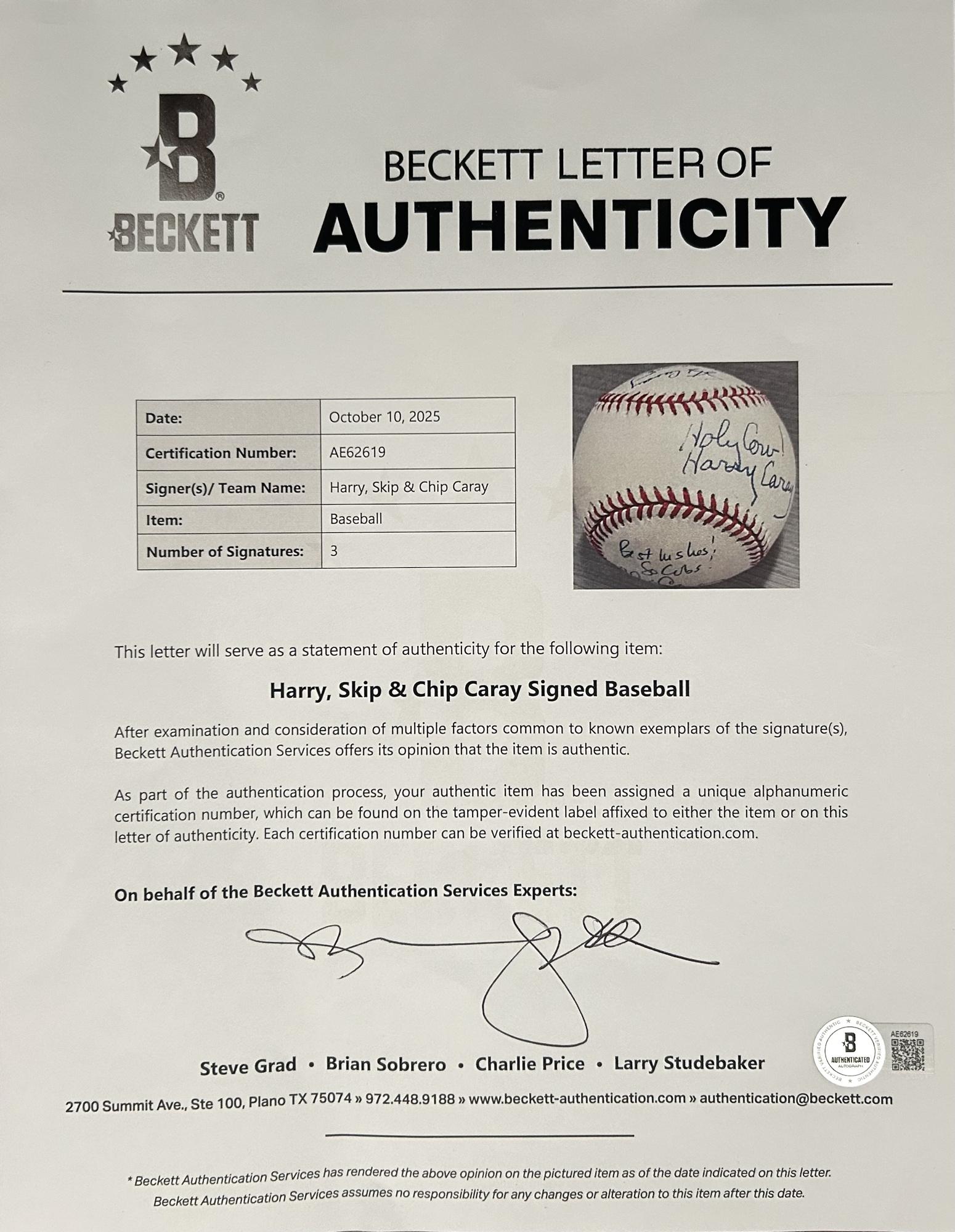 Harry Caray, Chip Caray & Skip Caray Signed ONL Baseball Inscribed "Holy Cow!", "Go Cubs!", Best Wishes!" & "Americas Team" (Beckett)