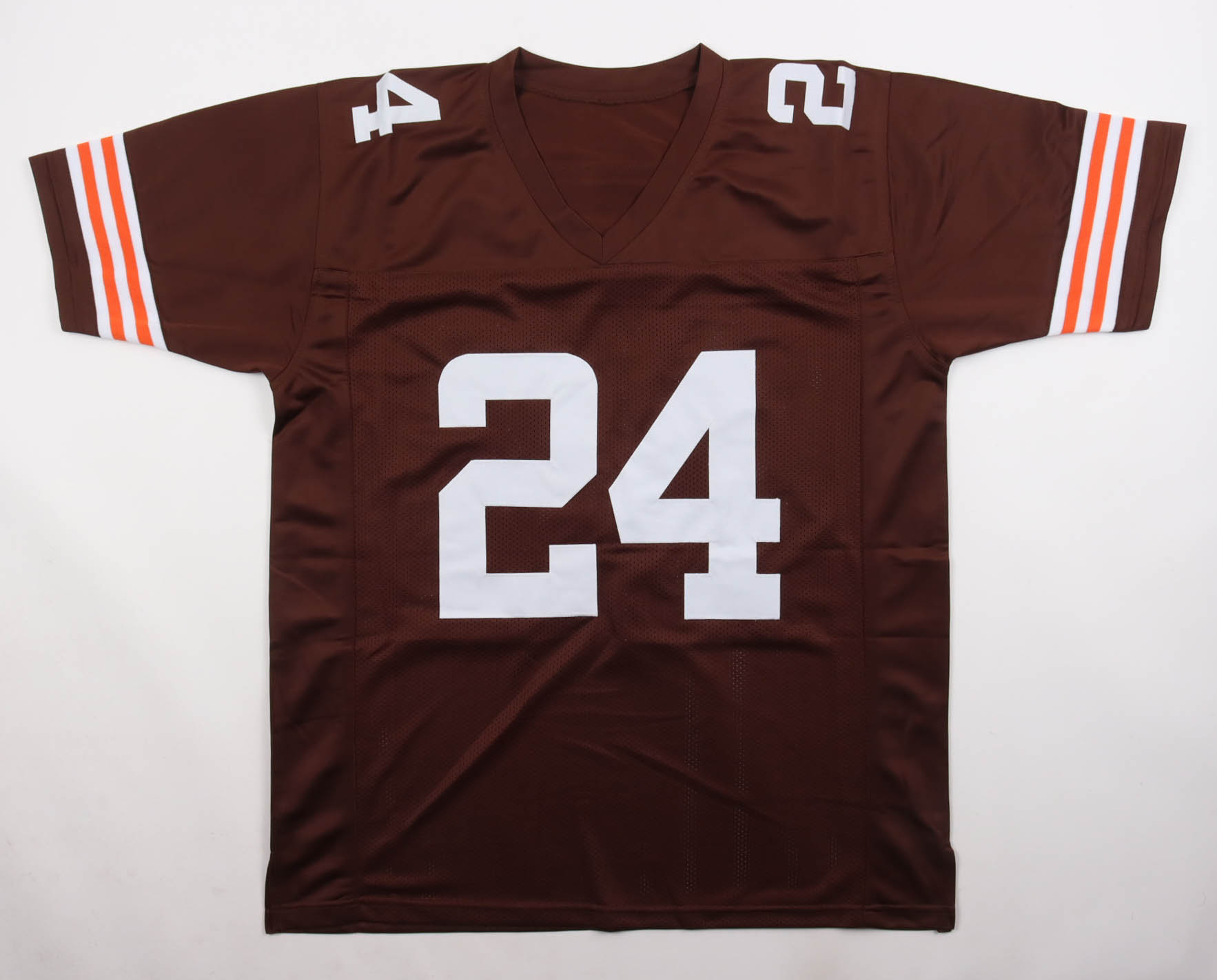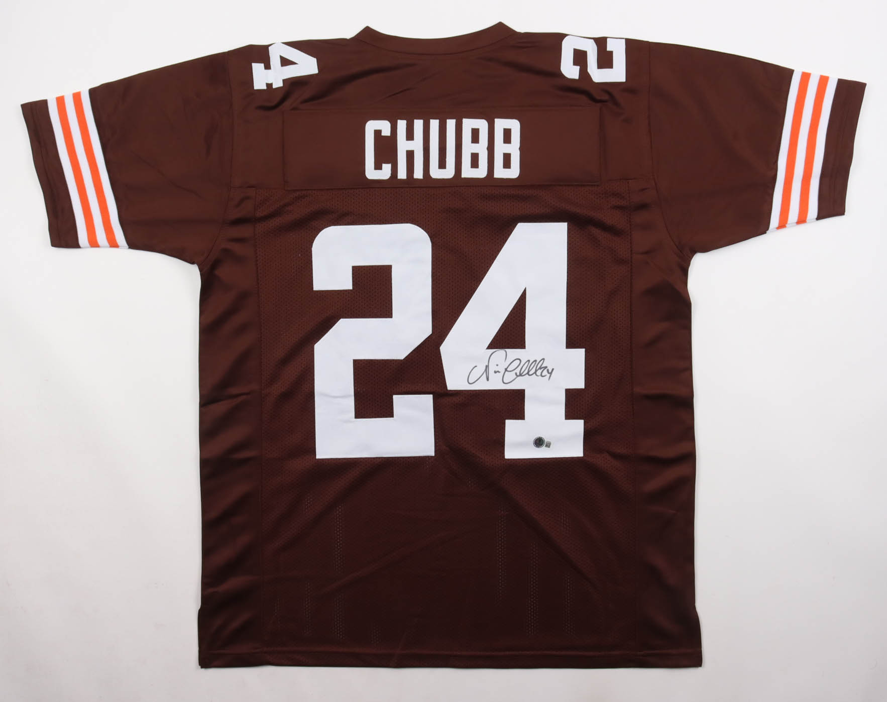 Custom jersey with everything sewn on, size XL. Hand-signed by Nick Chubb. Please note, there is staining above the hologram.