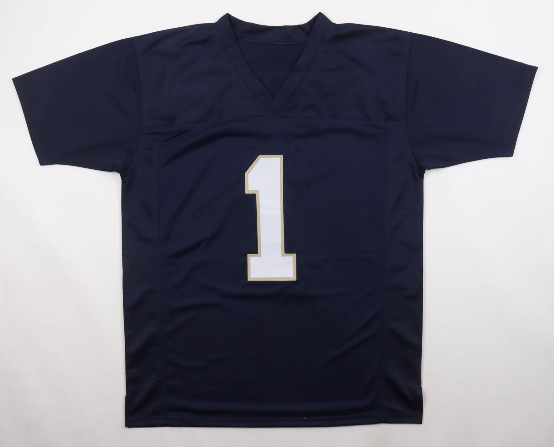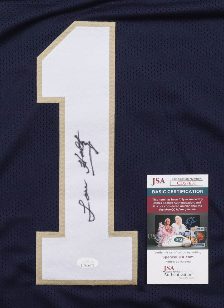 Custom jersey with everything sewn on, size XL. Hand-signed by Lou Holtz. Please note, the signature has bled.